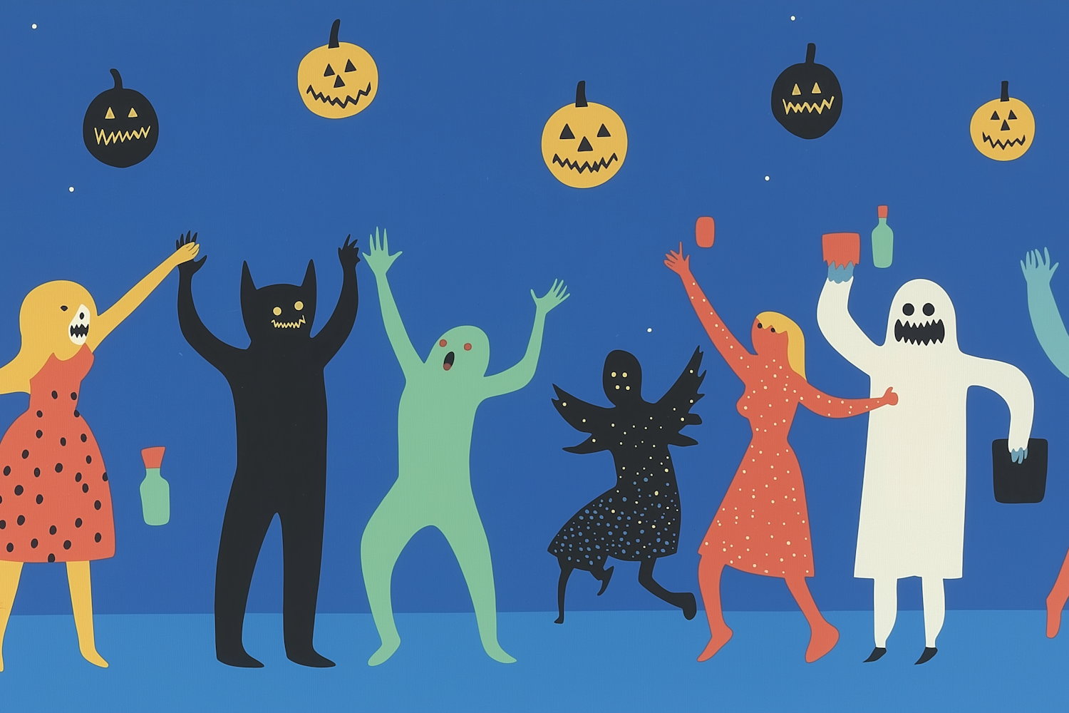 Colorful Halloween illustration with playful characters and floating jack-o'-lanterns on a blue background.