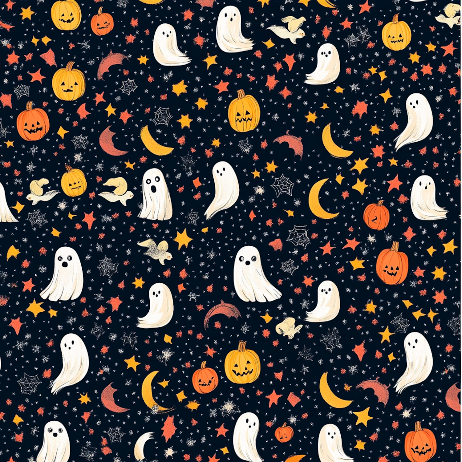 Playful Halloween pattern with ghosts, pumpkins, stars, and moons on a dark background. Perfect for festive decorations.