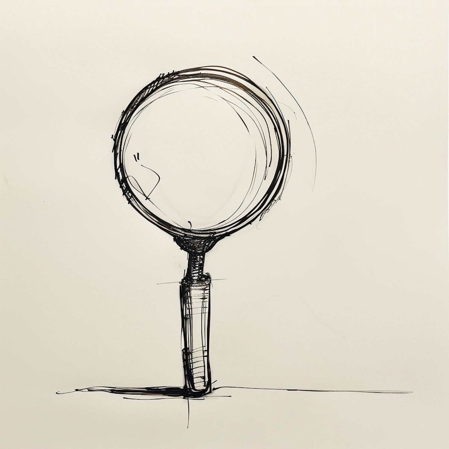 Minimalist black ink sketch of a magnifying glass on a white background, featuring rough, hand-drawn lines and an artistic touch.