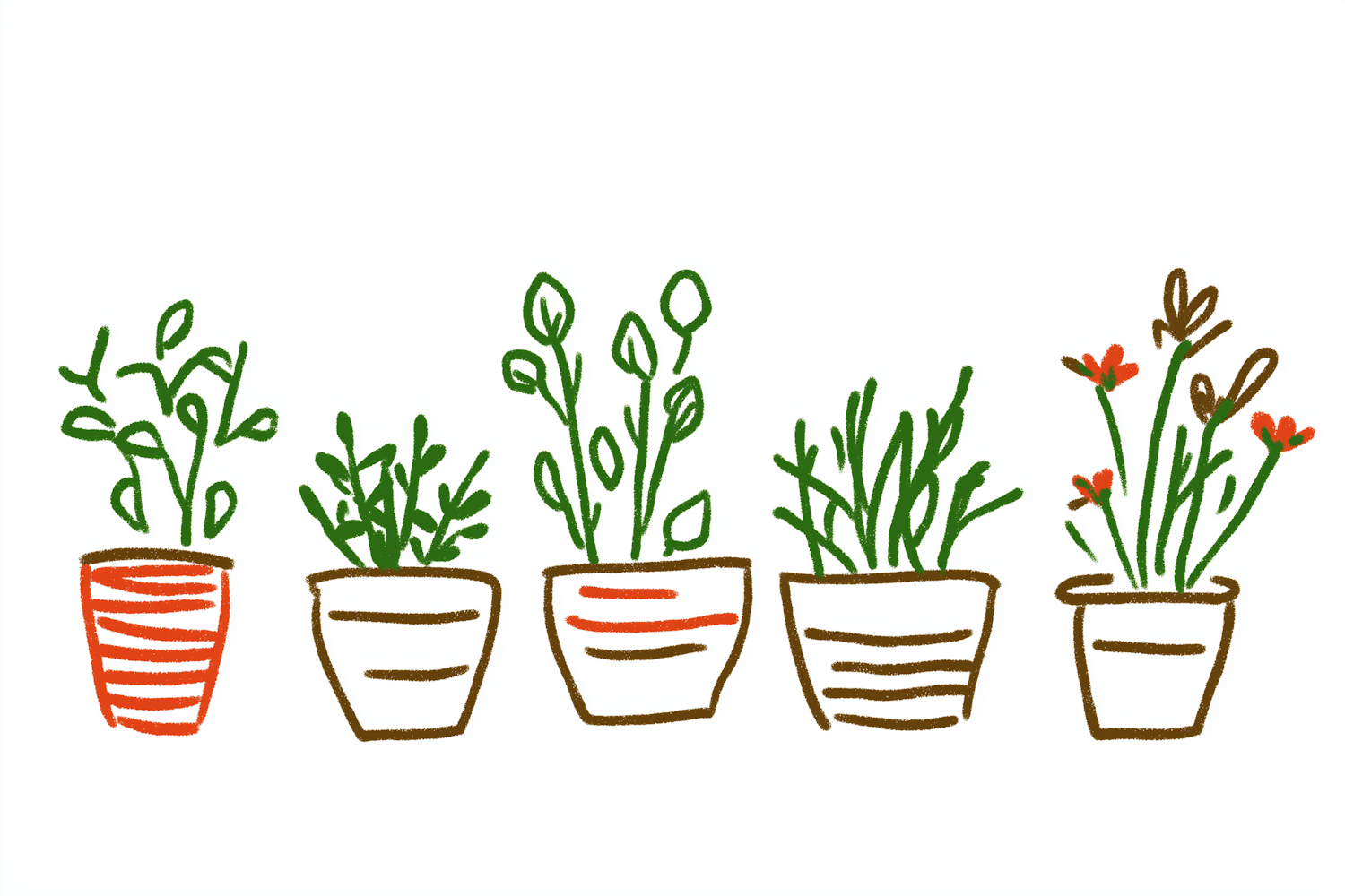 Illustration of five potted plants with unique designs and vibrant green leaves on a white background.