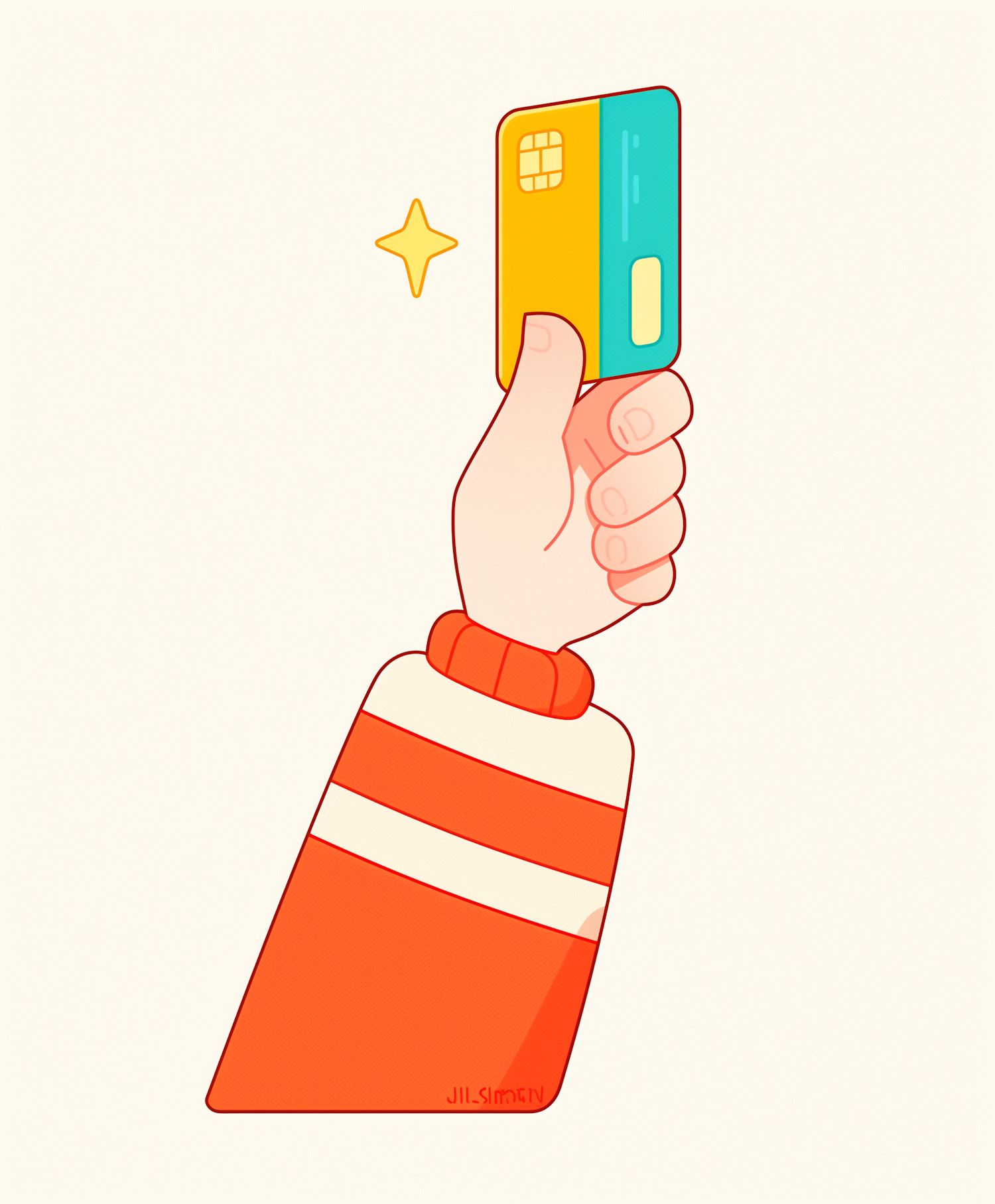 Cartoon hand holding a colorful credit card with a star, symbolizing financial success or excitement.