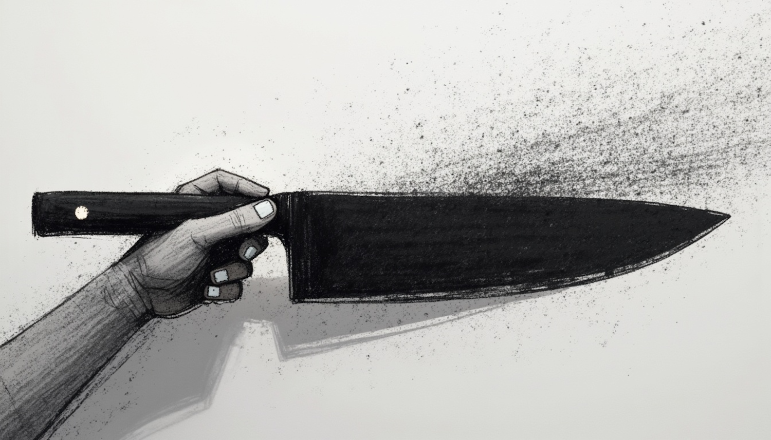 Illustration of a hand gripping a large kitchen knife with a textured blade and dynamic black particle effects on a light background.
