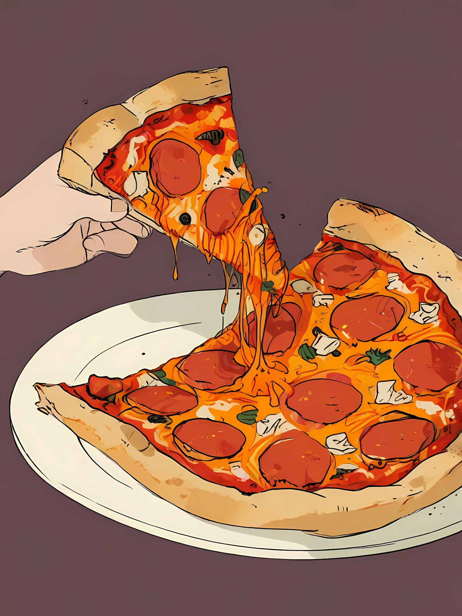 Illustration of a hand pulling a cheesy pepperoni pizza slice from a plate, with vibrant colors and a stringy cheese effect.