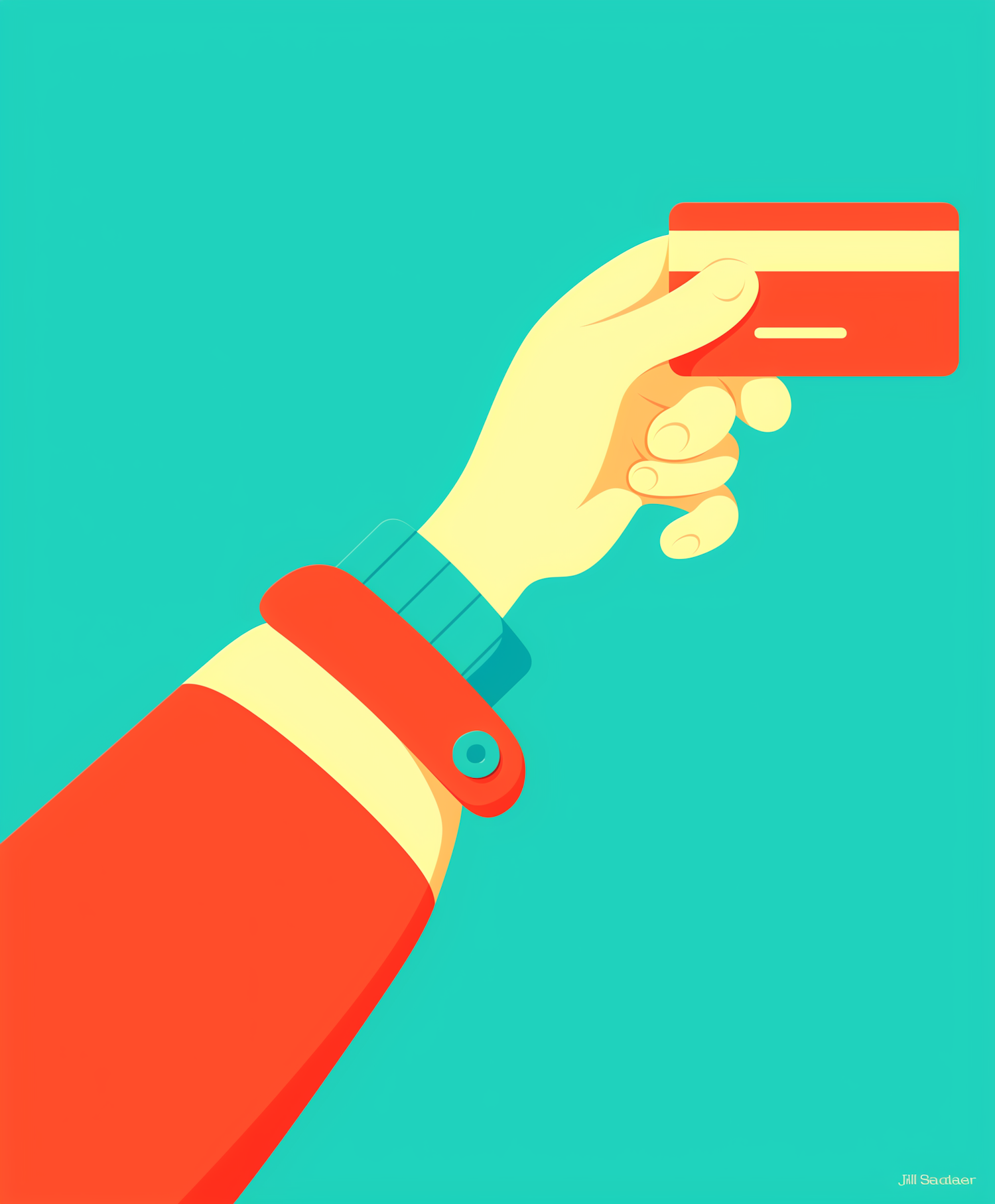 Minimalist illustration of a hand holding a red credit card with a teal background, emphasizing modern payment methods.