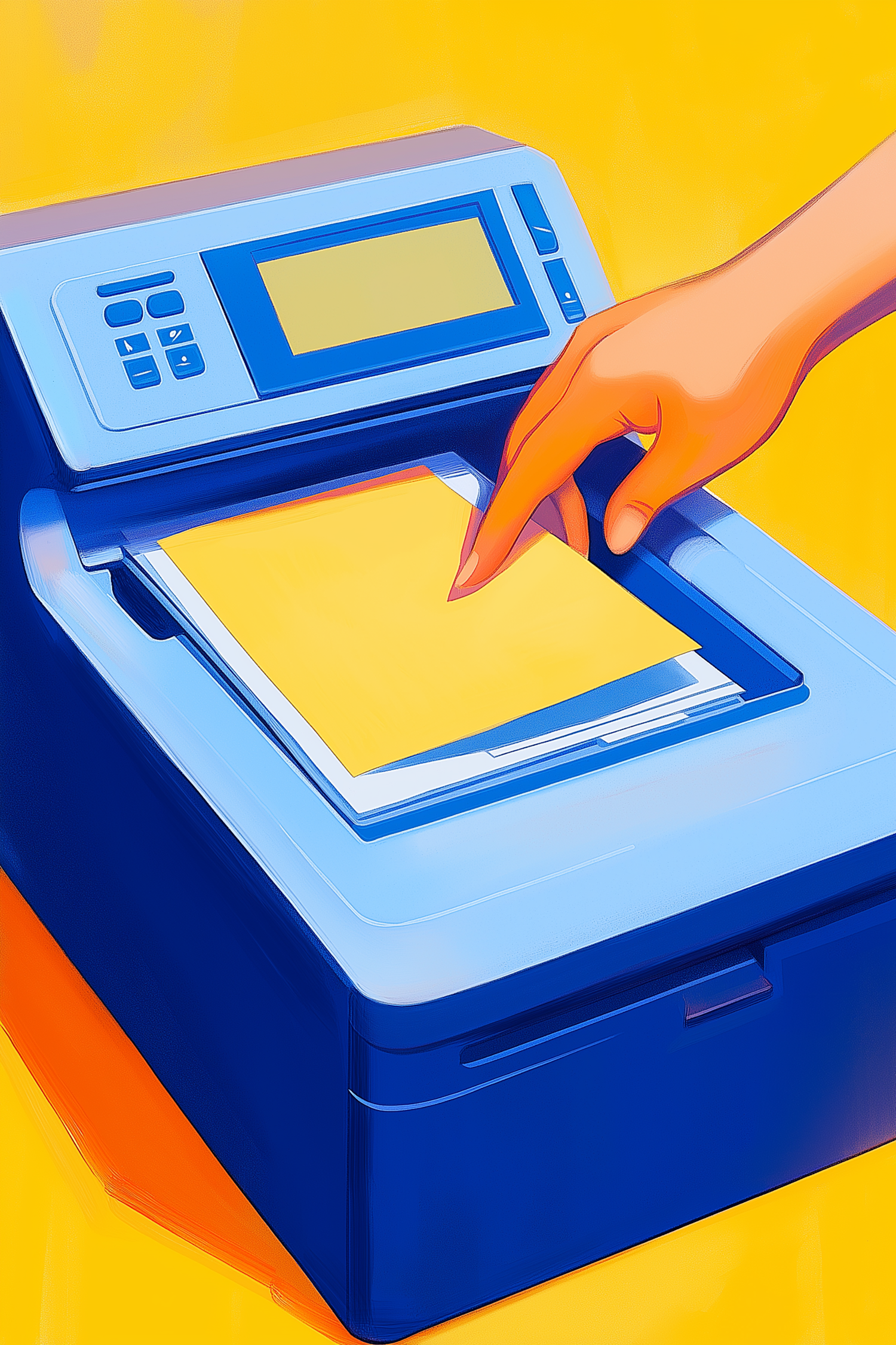 A hand places a yellow paper into a blue printer against a bright yellow background, highlighting modern office technology.