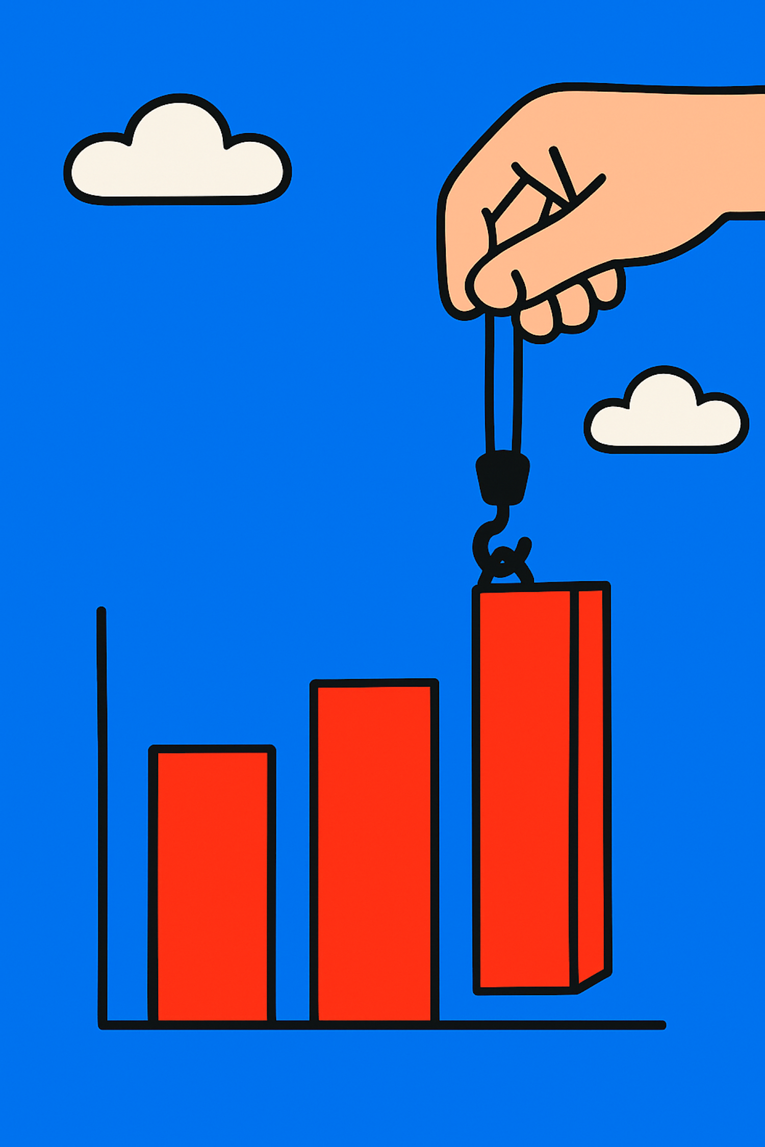 Minimalist illustration of a hand lifting a red bar in a graph, symbolizing growth or manipulation, set against a bright blue background.