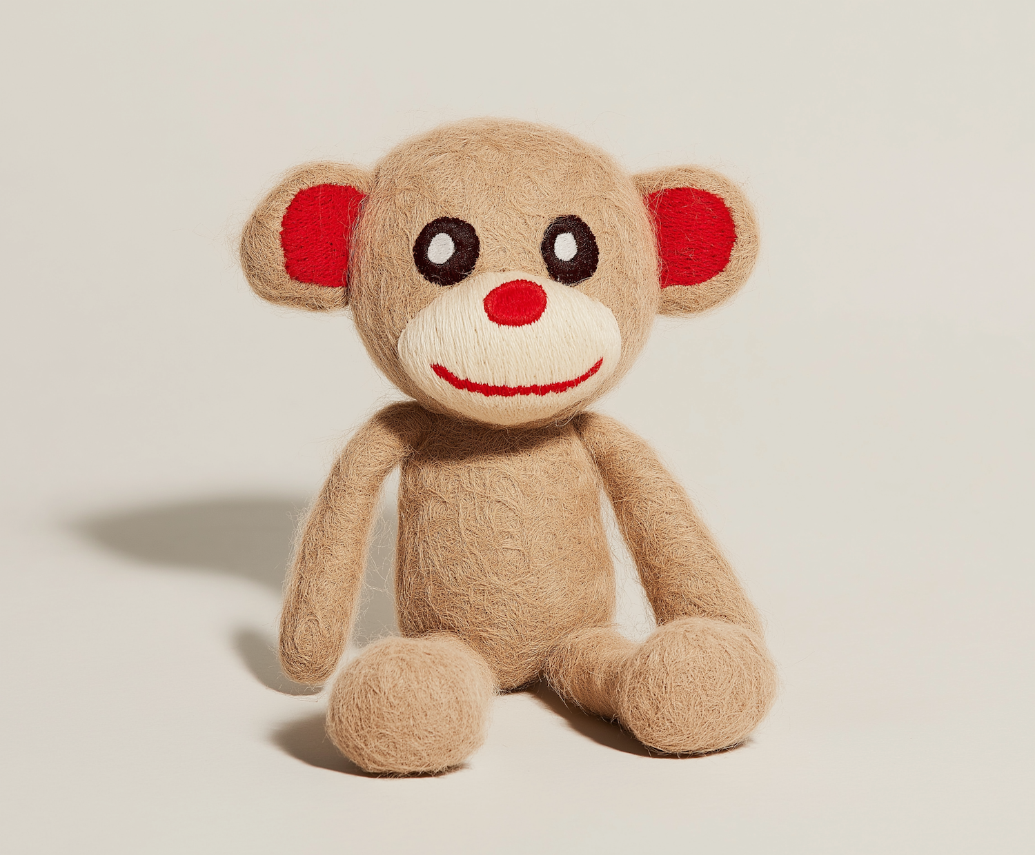 Adorable felt monkey doll with red accents and a cheerful smile, perfect for decor or gifting. Handmade charm in a minimalist setting.