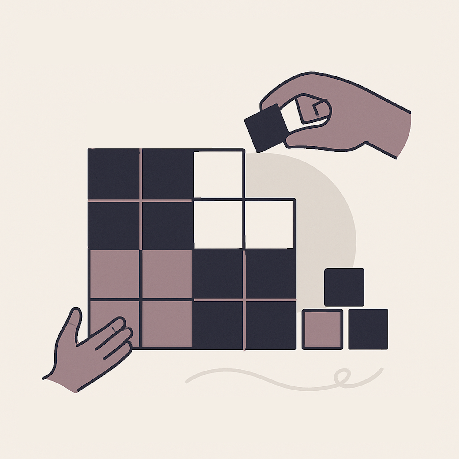 Minimalist illustration of hands arranging black, white, and mauve squares on a grid, symbolizing organization or creativity.