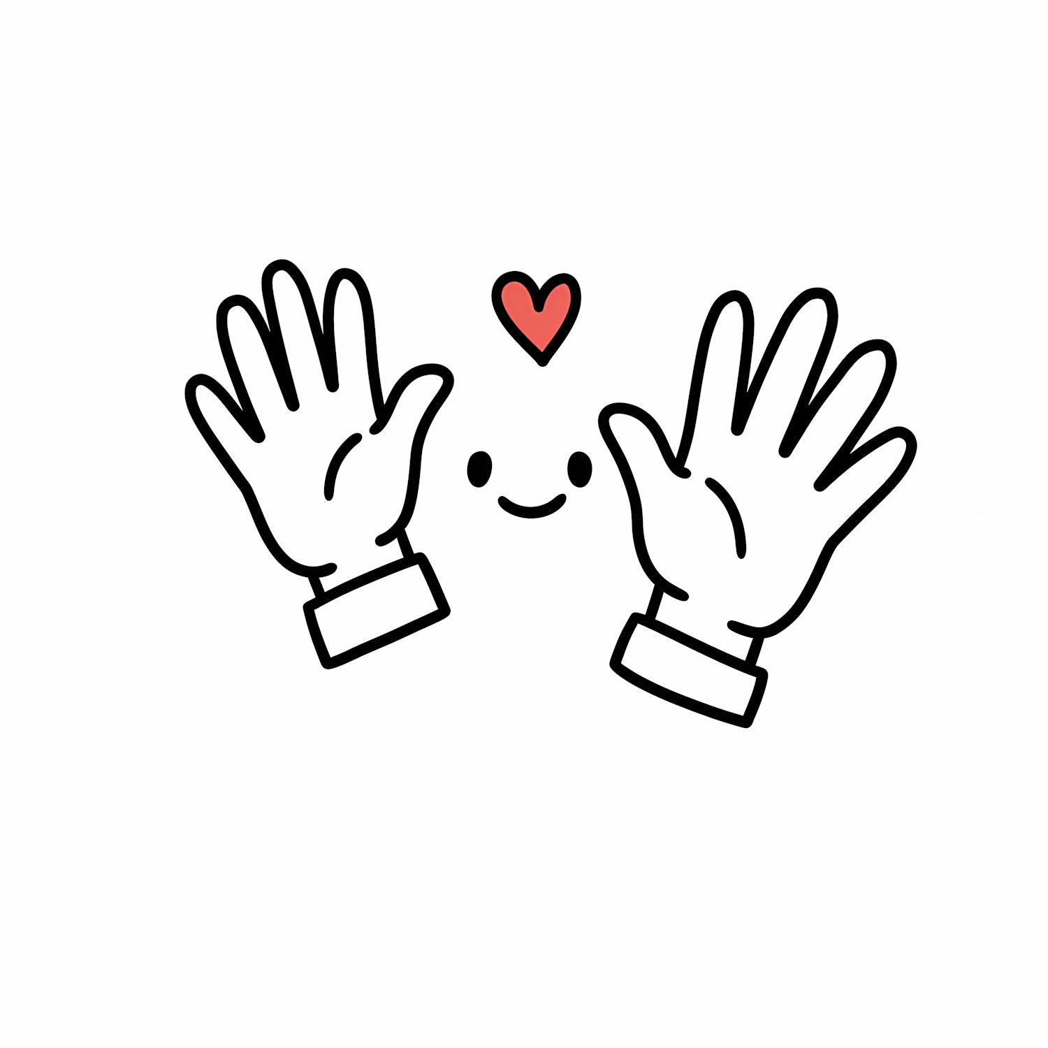 Minimalist illustration of raised hands, a smiling face, and a red heart, symbolizing positivity and care.