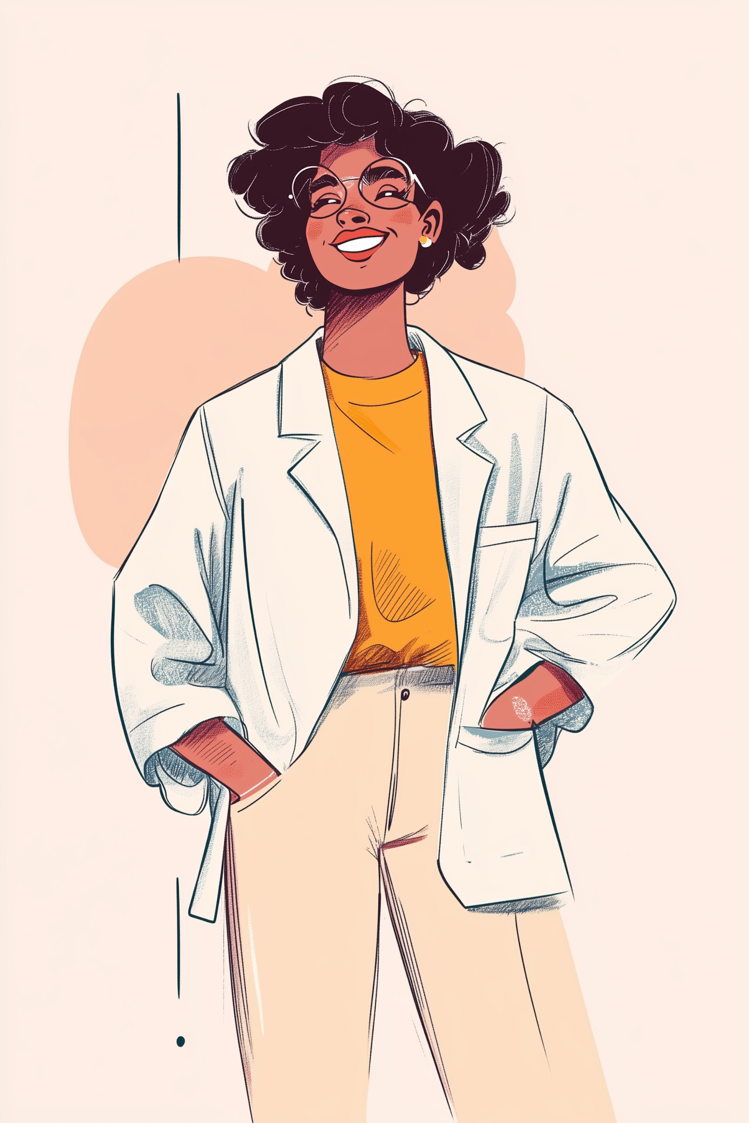 Illustration of a person in a lab coat with curly hair and glasses, exuding confidence and warmth against a peach background.