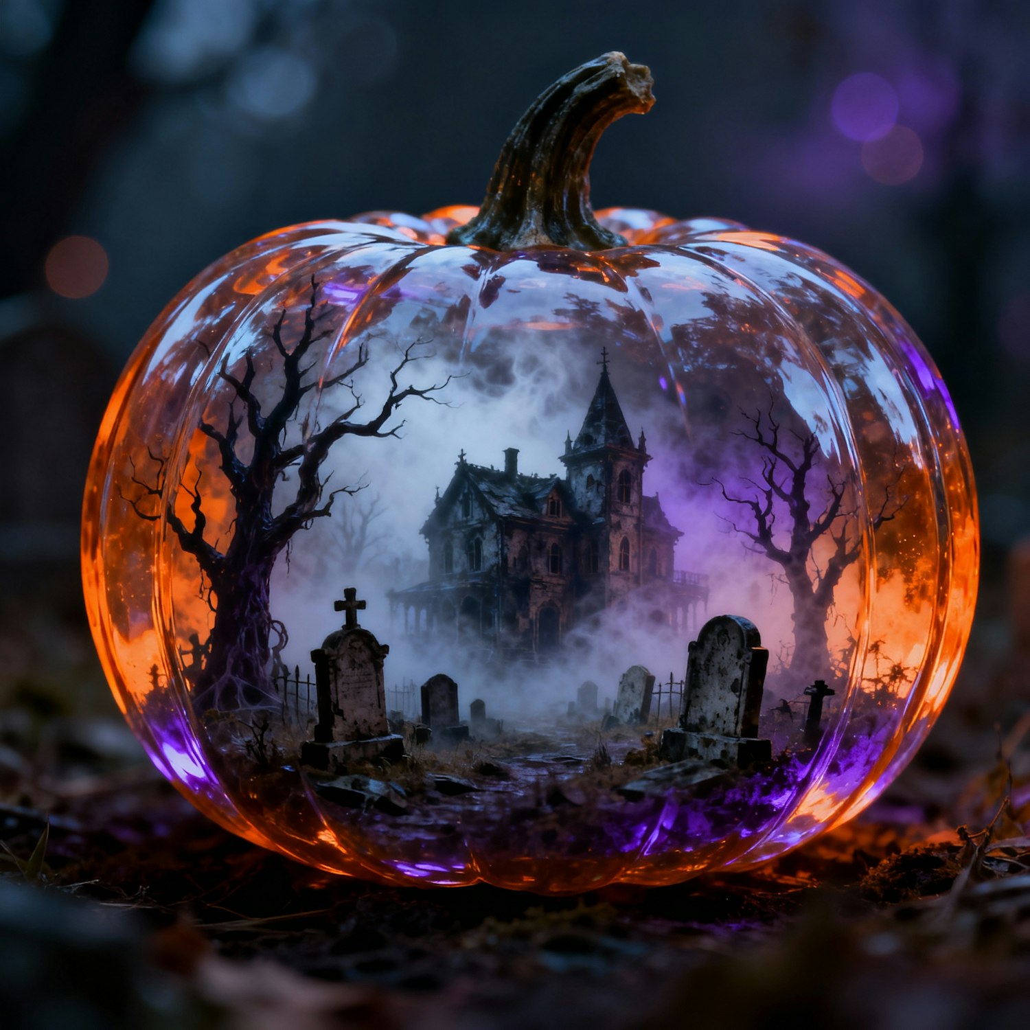 A glowing pumpkin reveals a spooky graveyard and haunted mansion inside, illuminated by eerie purple and orange light.