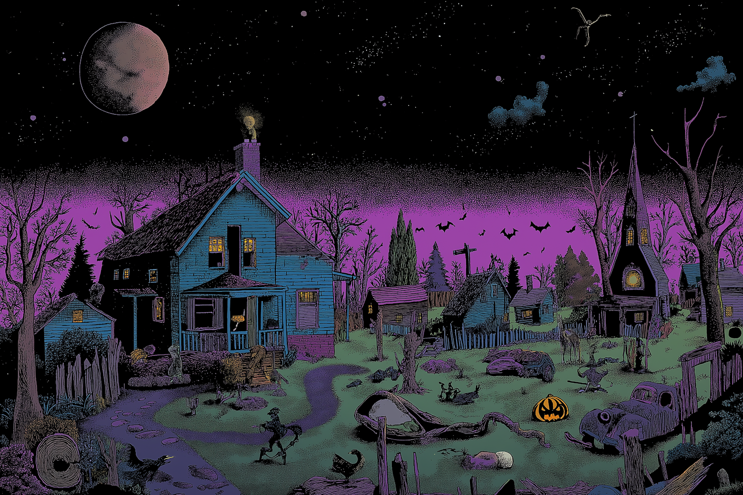 Eerie Halloween scene with a haunted house, glowing windows, bats, and a sinister pumpkin under a starry, purple-tinted sky.