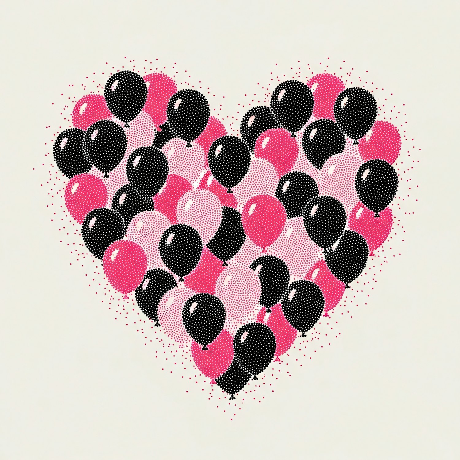 A heart-shaped design made of pink and black balloons in a halftone dot style, set against a light background.