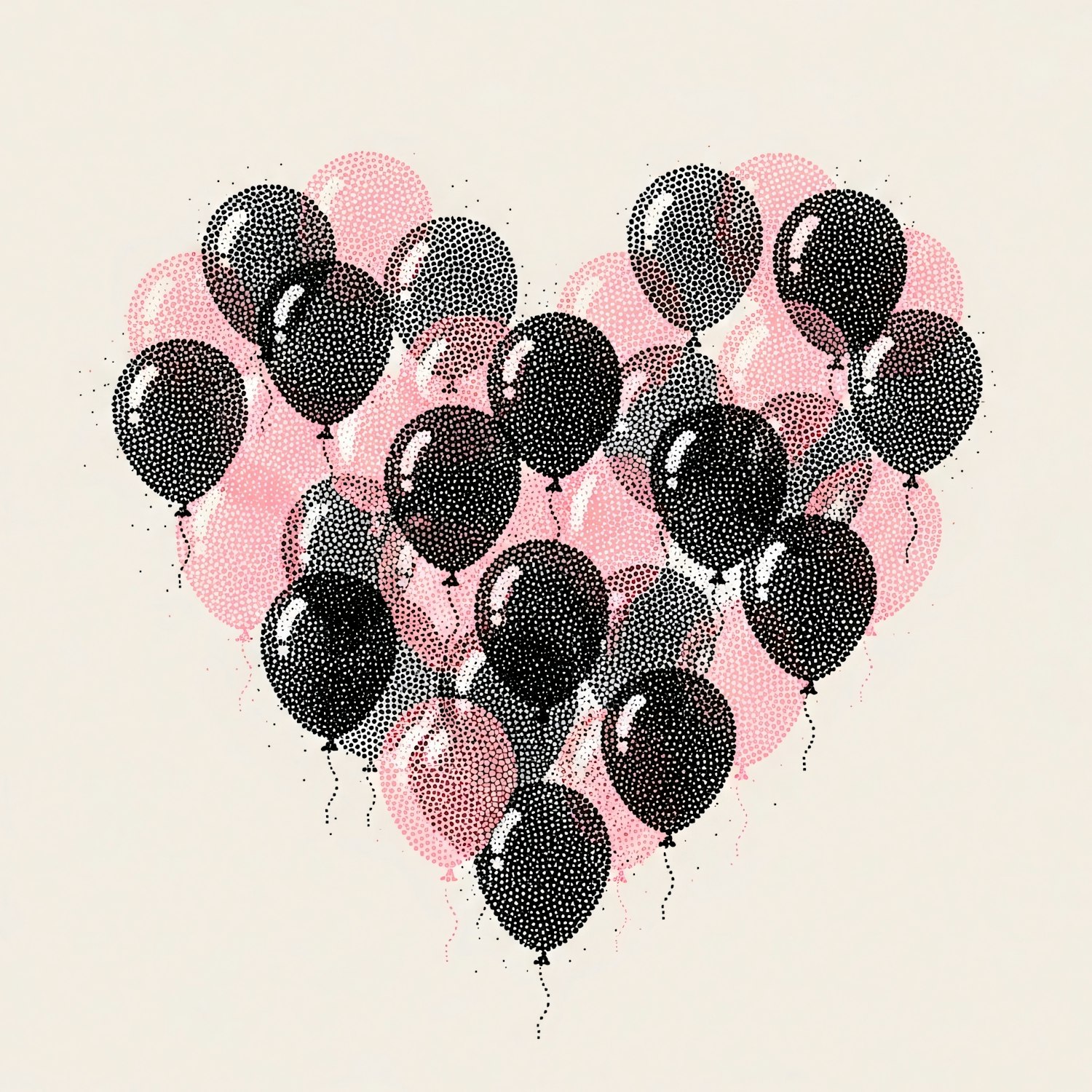 A heart-shaped arrangement of black and pink balloons in a halftone style on a beige background, creating a retro and artistic vibe.