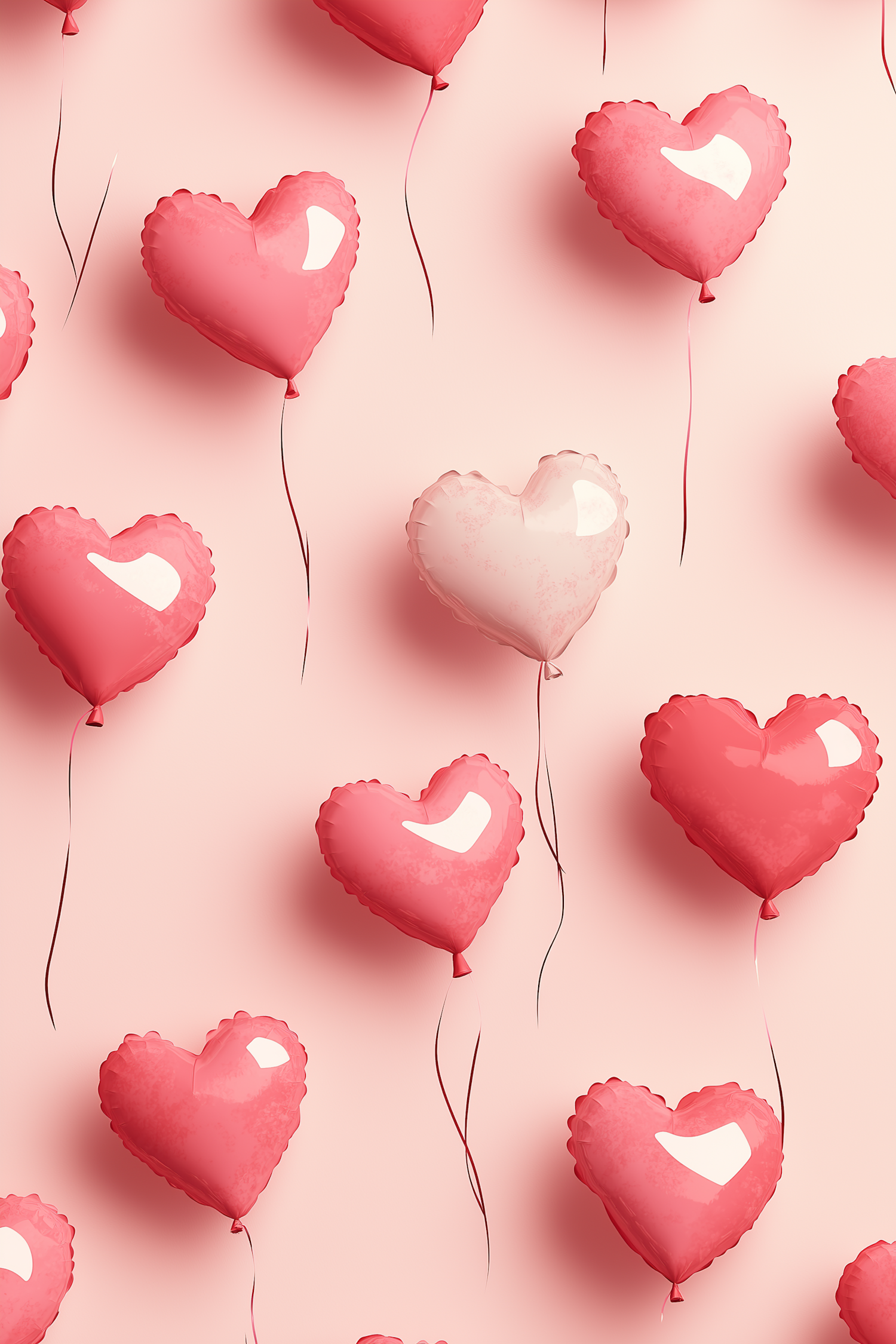 Heart-shaped pink and red balloons with glossy reflections float on a pastel pink background, creating a romantic and playful vibe.