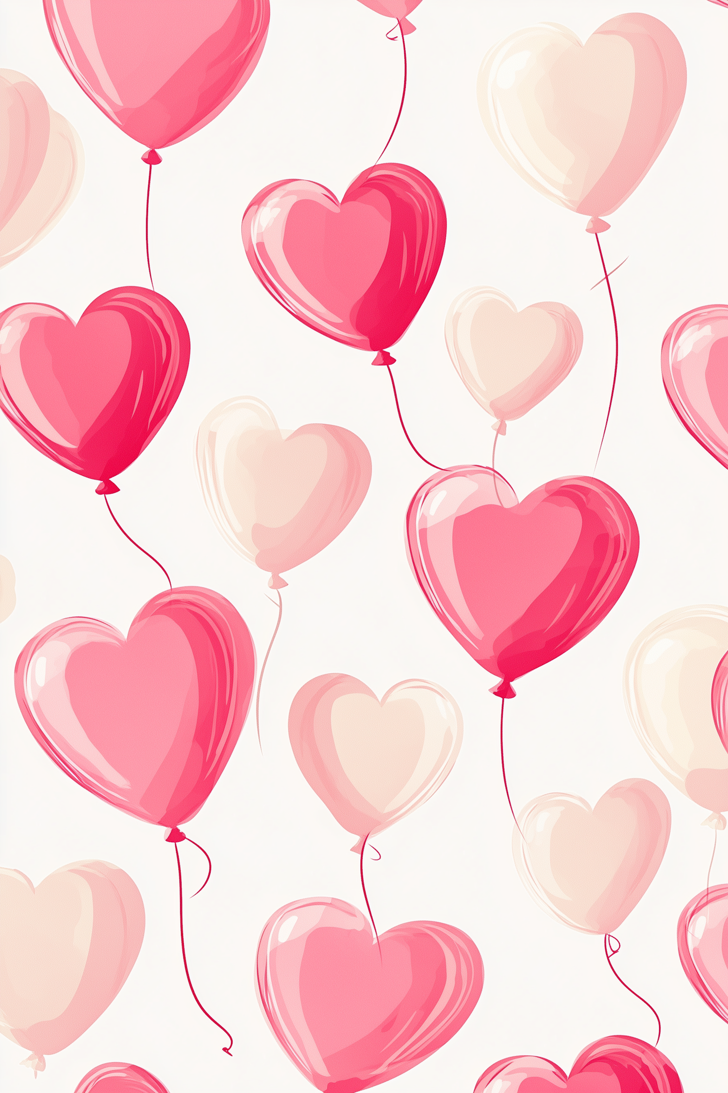 Heart-shaped pink and cream balloons with glossy highlights float on a white background, creating a romantic and playful vibe.