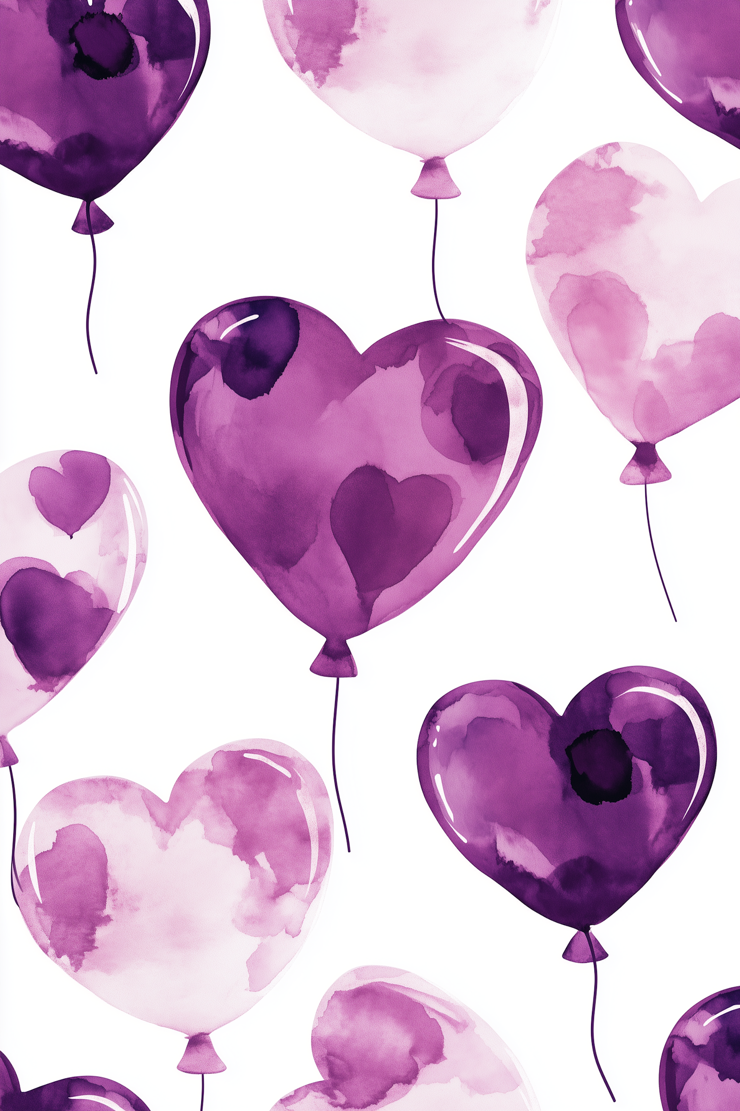 Watercolor heart-shaped balloons in purple and pink on a white background, creating a playful and romantic vibe.