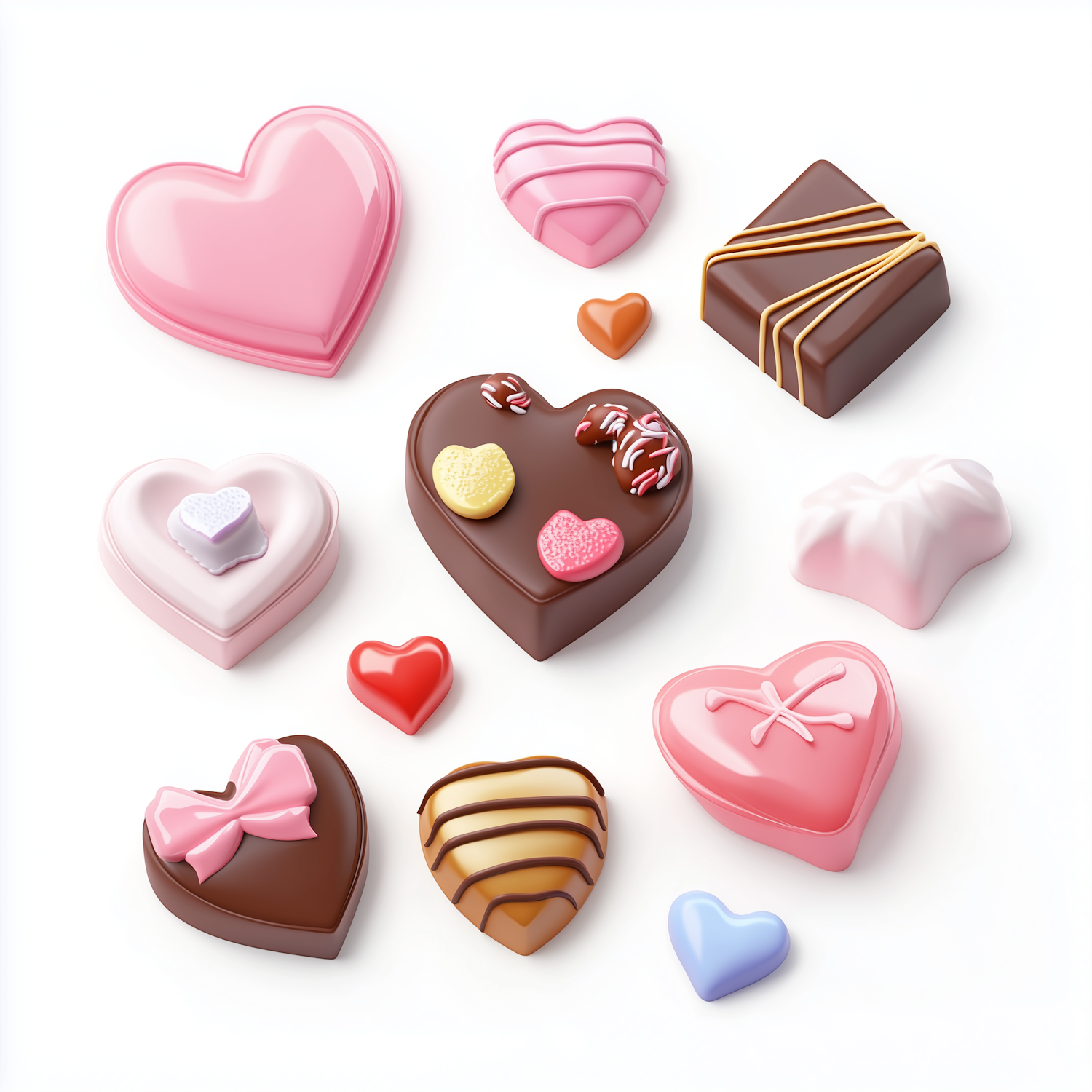 Assorted heart-shaped chocolates and candies in vibrant colors and designs on a white background.