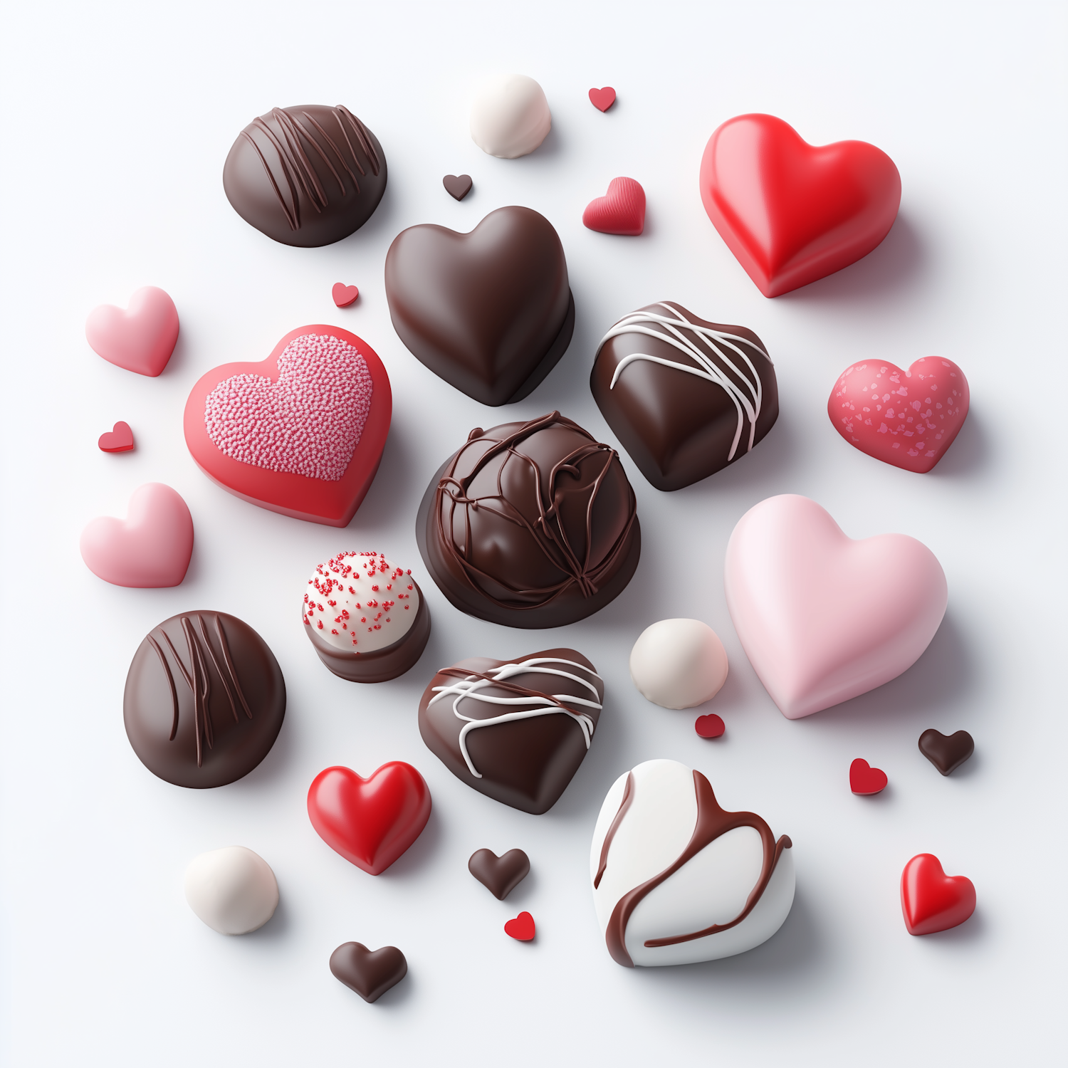 Assorted heart-shaped chocolates and candies in red, pink, and brown hues on a white background, perfect for a romantic occasion.