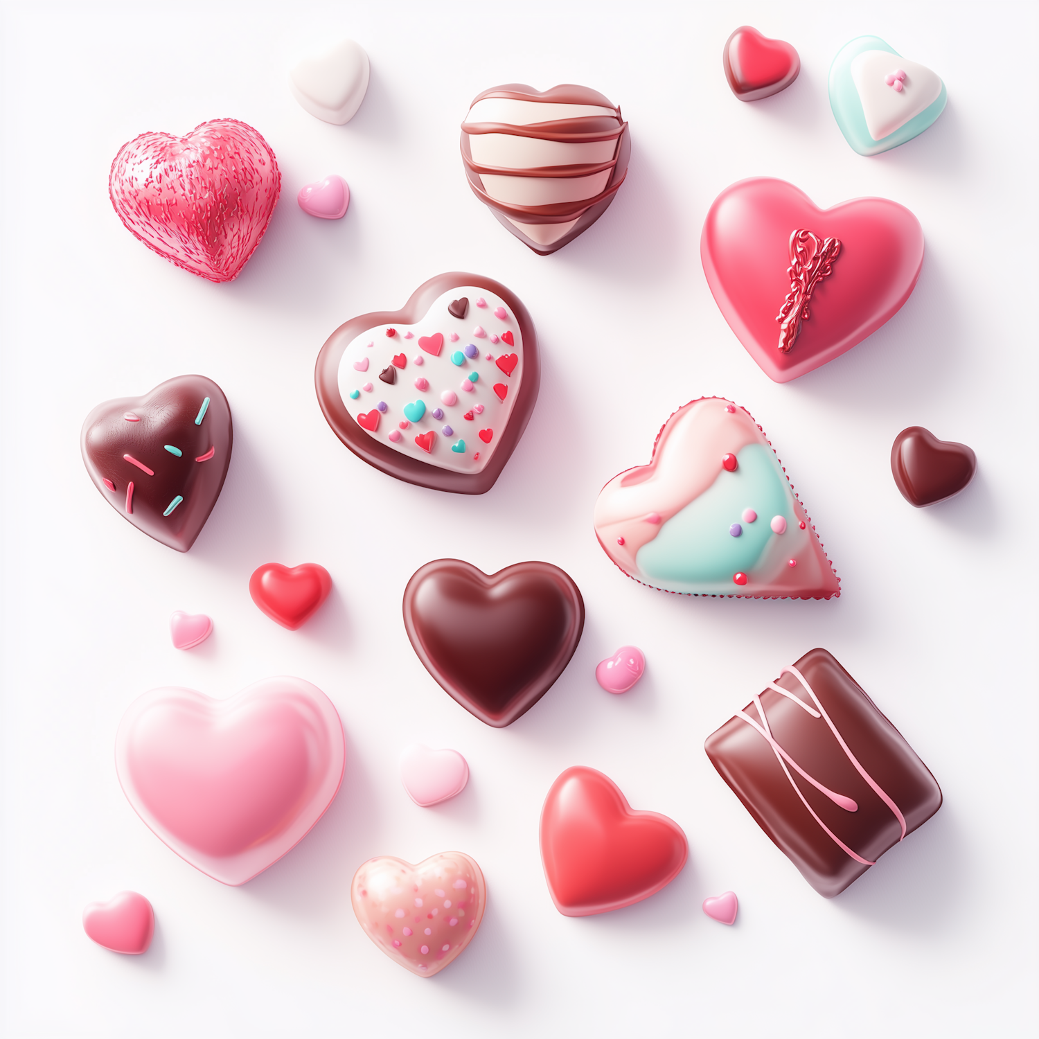 Heart-shaped chocolates and candies in vibrant pinks, reds, and browns, featuring intricate designs and festive decorations.