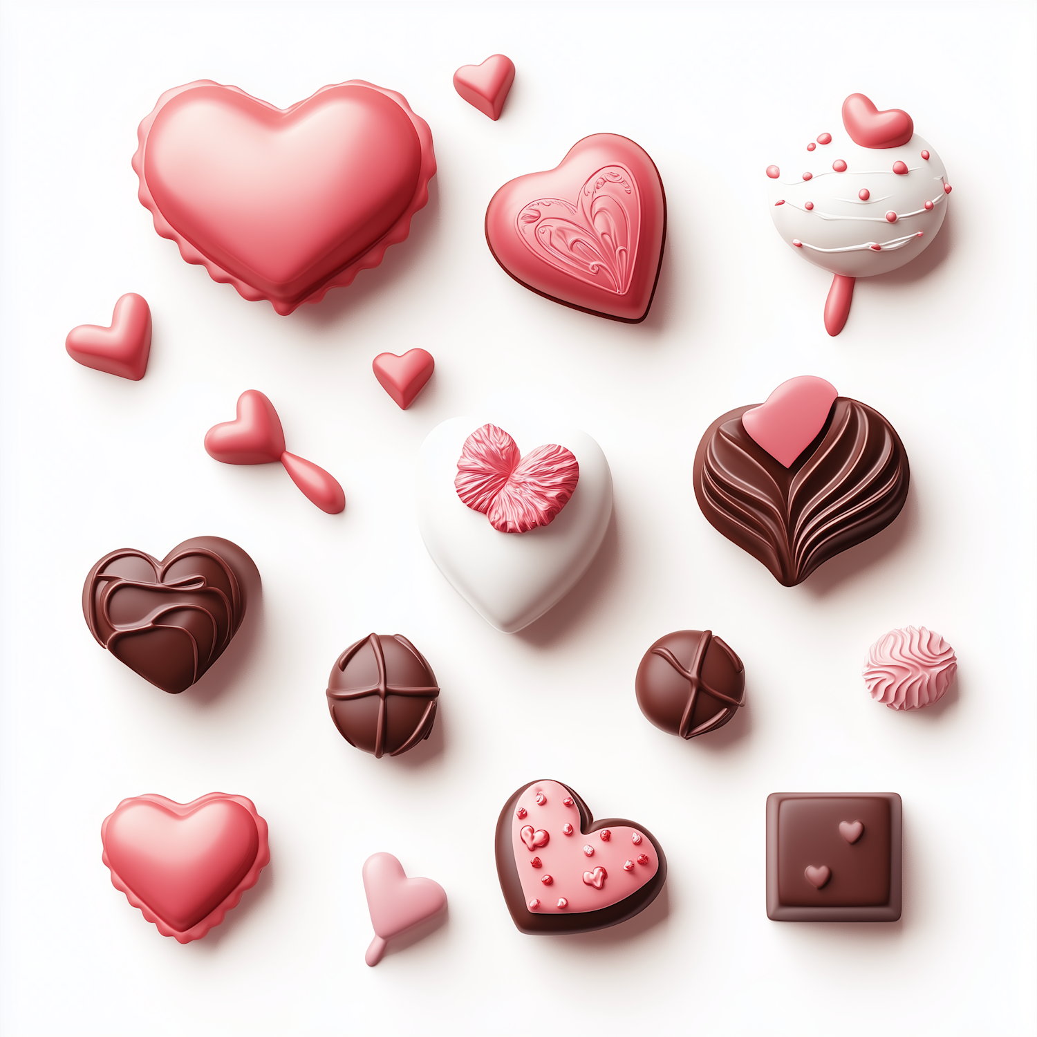 Assorted heart-shaped chocolates in pink, red, and brown with intricate designs, perfect for a romantic gift or treat.