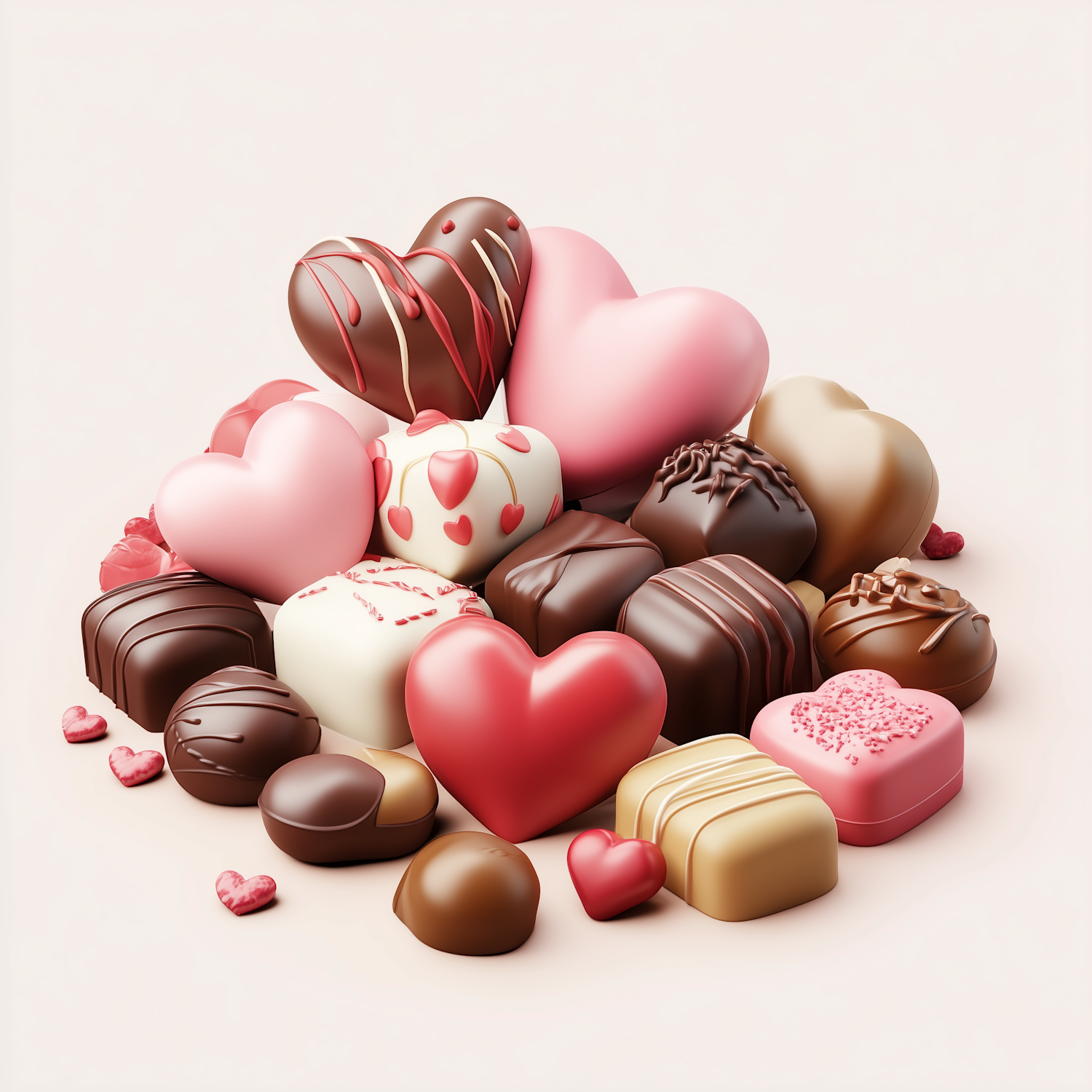 A delightful assortment of heart-shaped chocolates in pink, brown, and white, perfect for a romantic or celebratory occasion.