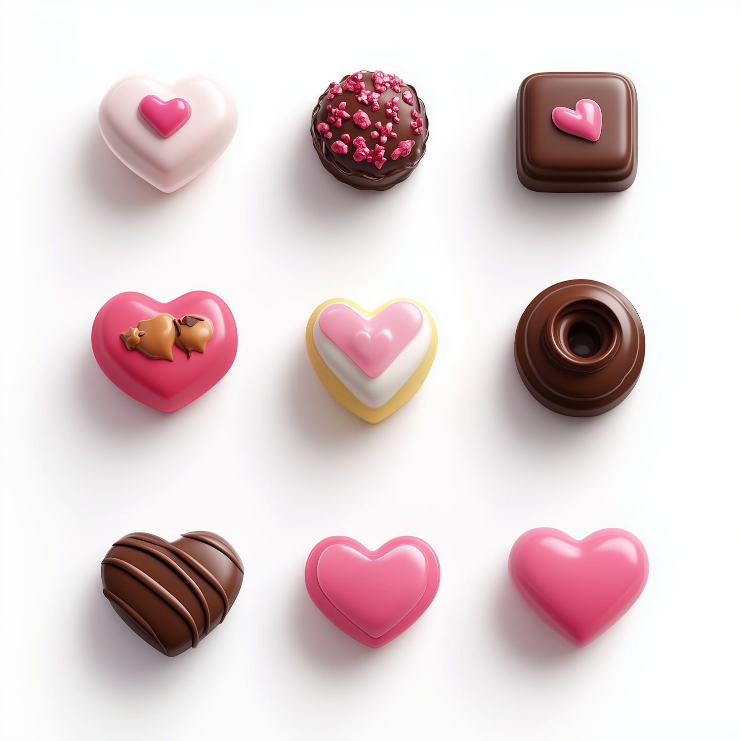 Assorted heart-shaped chocolates and candies in a 3x3 grid, featuring pink, white, and chocolate colors on a white background.