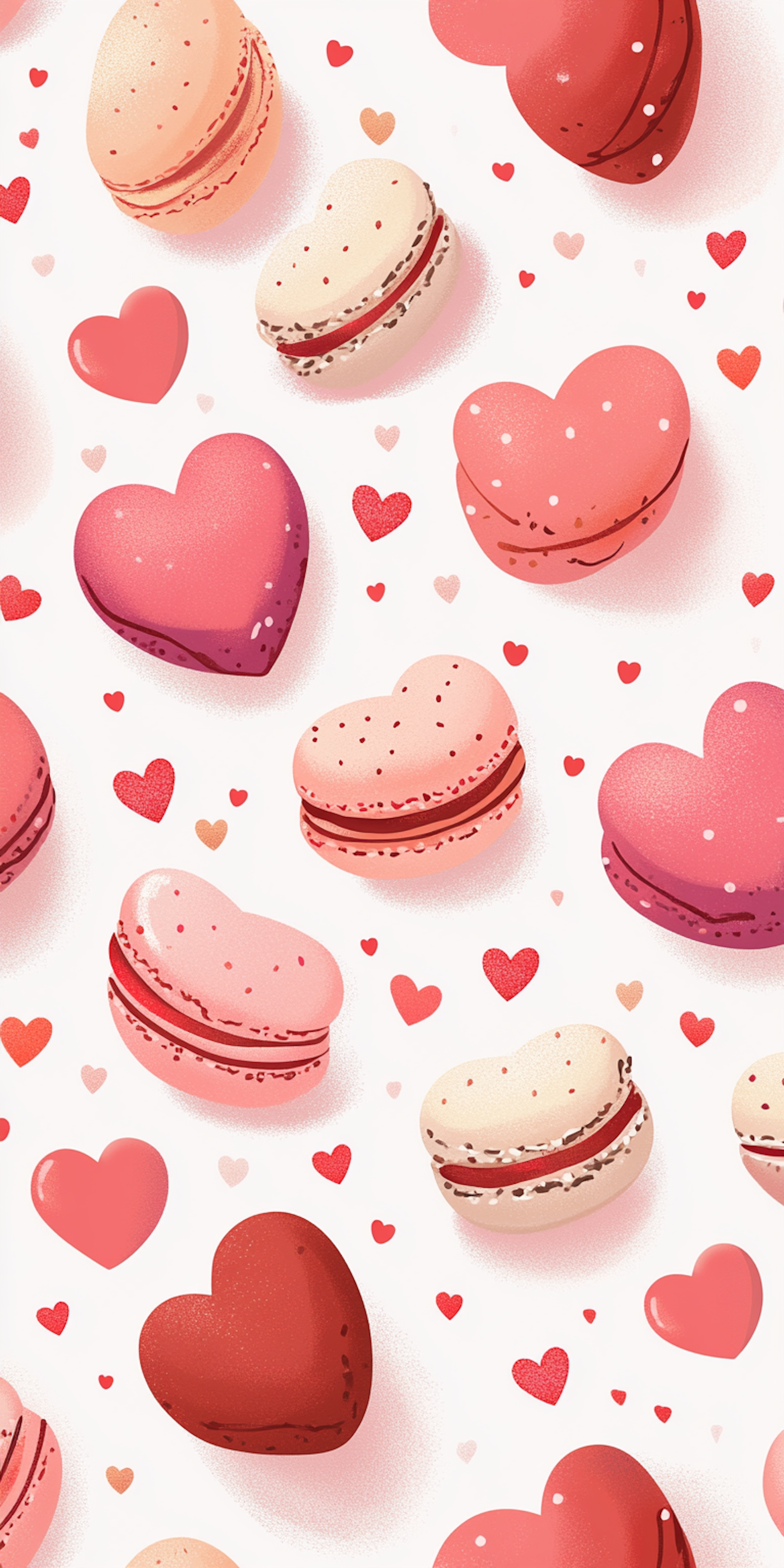 Heart-shaped macarons and hearts in pink, red, and cream on a white background create a playful, romantic pattern.