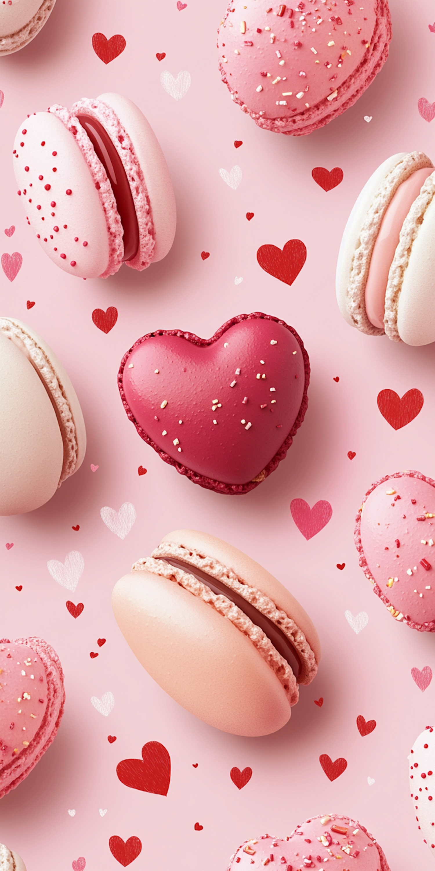 Heart-shaped and round pink macarons with sprinkles on a pink background, surrounded by decorative hearts.