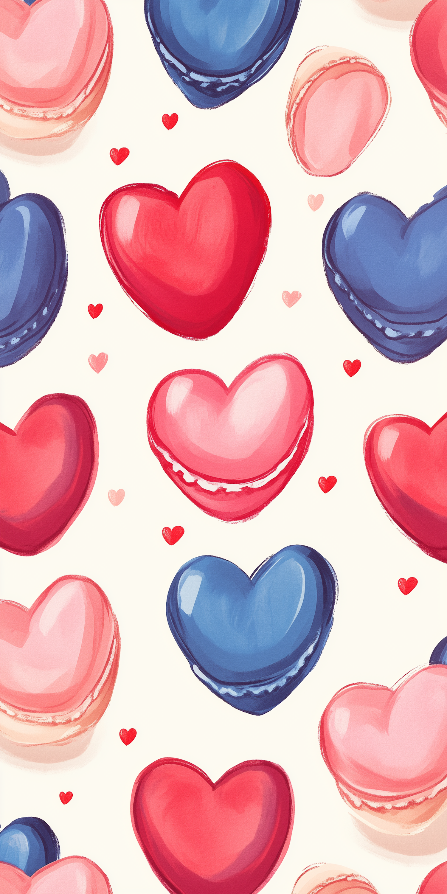 Colorful heart-shaped macarons and small hearts on a cream background create a playful and romantic pattern.