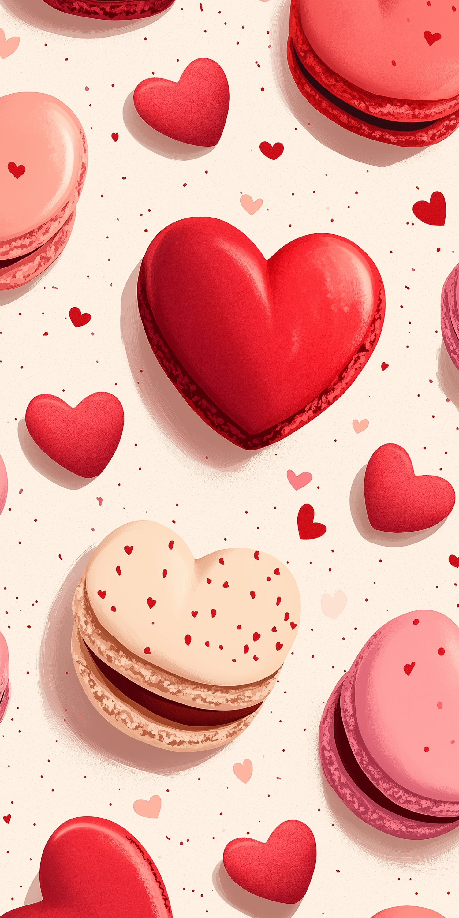 Heart-shaped macarons and small hearts in red, pink, and cream create a romantic, playful pattern on a light background.