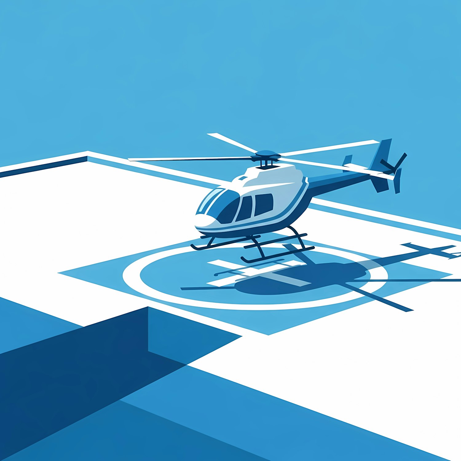 Minimalist illustration of a helicopter on a rooftop helipad, featuring a clean blue and white color scheme and a clear sky background.