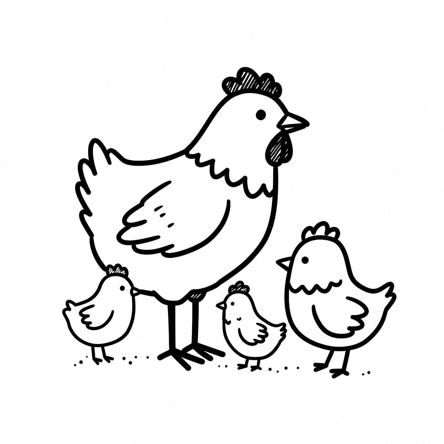 A charming black-and-white illustration of a hen with her four chicks, drawn in a simple and clean cartoon style.