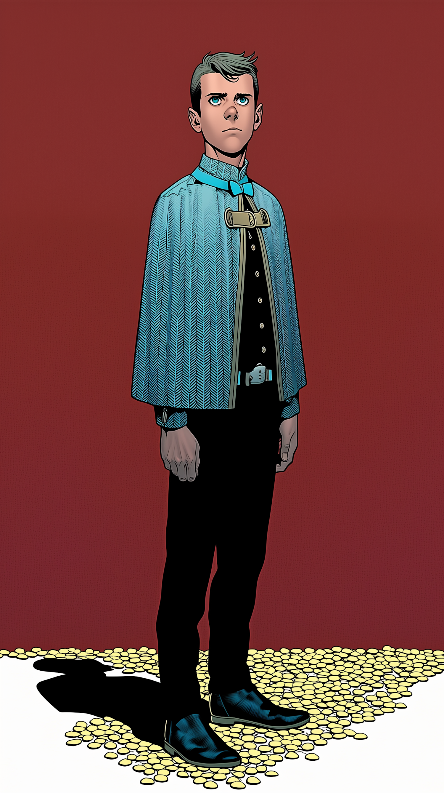 A young person in a blue cape stands on gold coins against a red background, exuding a sense of determination and opulence.