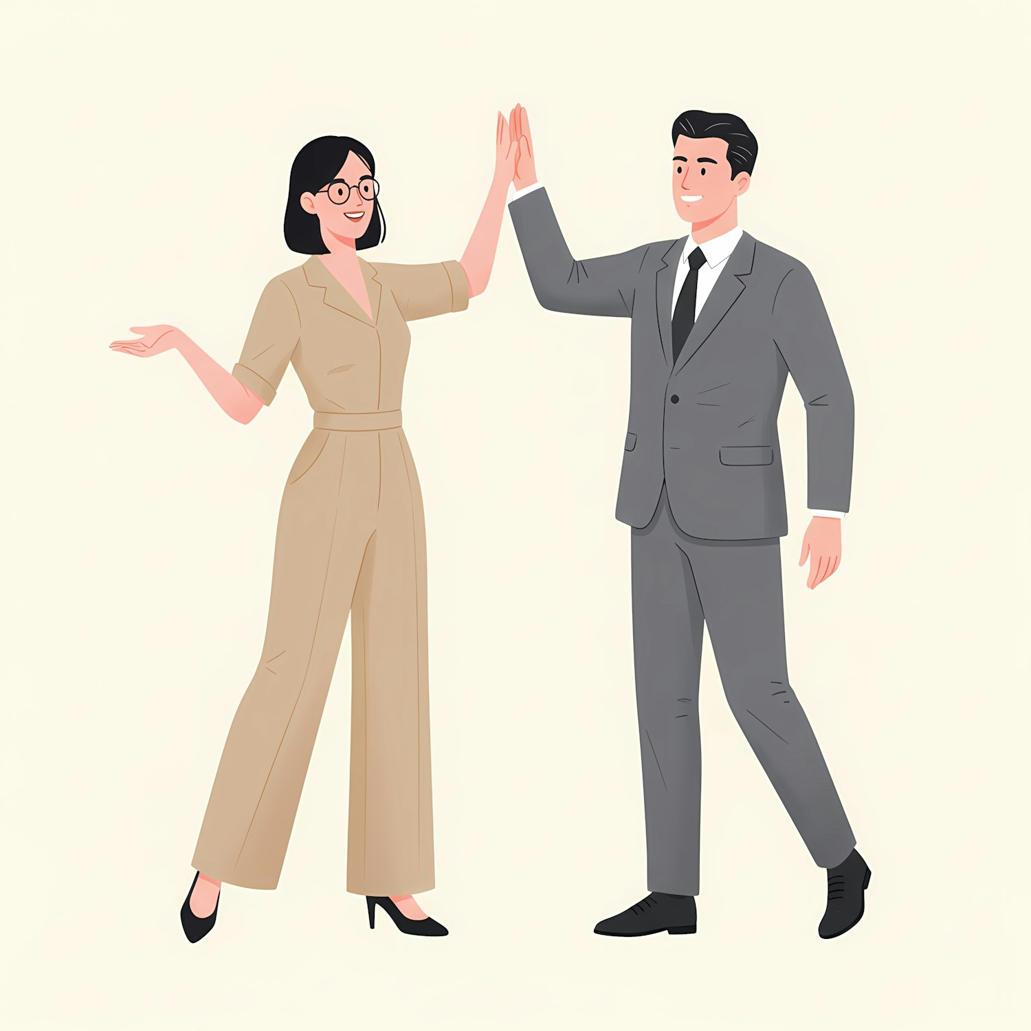 Illustration of a man and woman high-fiving, dressed in business attire, celebrating teamwork or success.