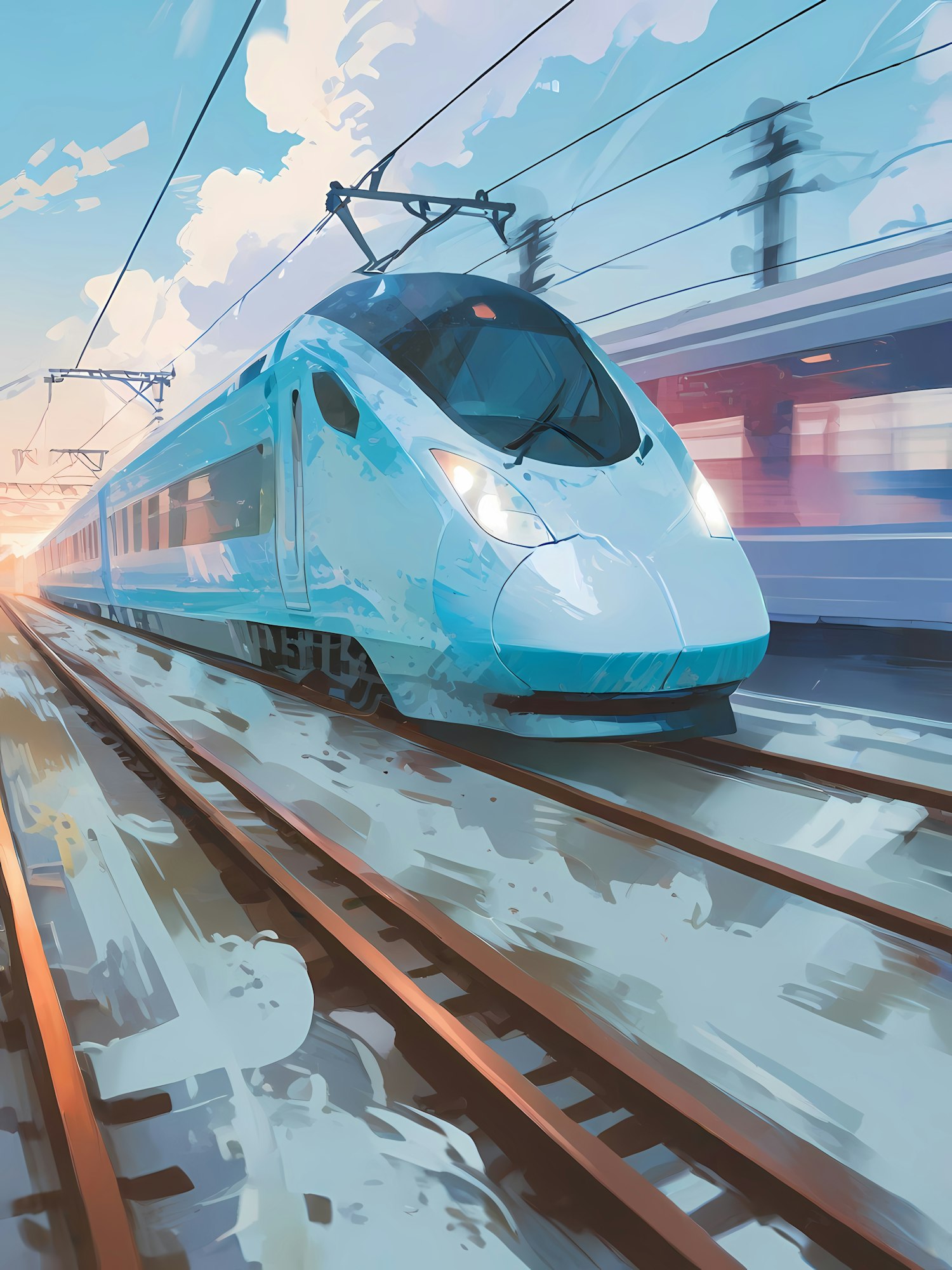 A futuristic high-speed train glides on tracks under a vibrant sky, with another train passing by in the background. Dynamic and modern.