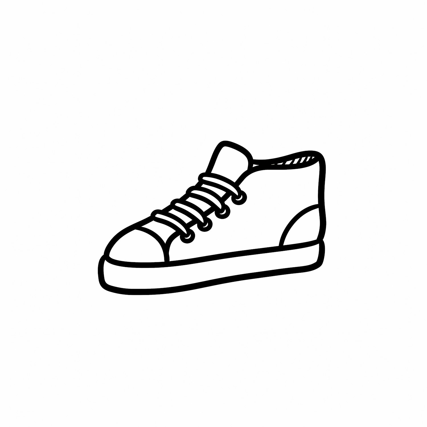 A clean black-and-white line drawing of a high-top sneaker with detailed laces and a thick sole, set against a plain white background.