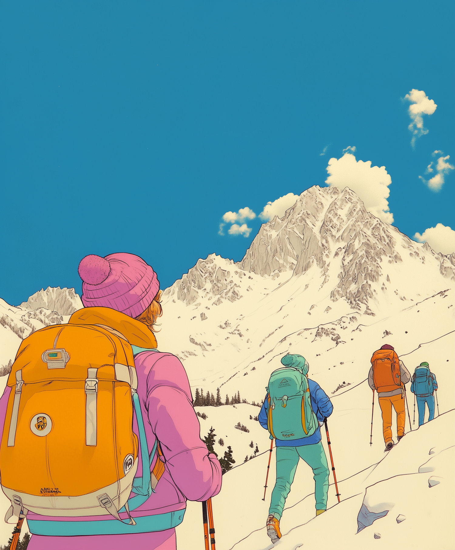 Colorful hikers trek up a snowy mountain under a clear blue sky, showcasing vibrant winter gear and majestic peaks.
