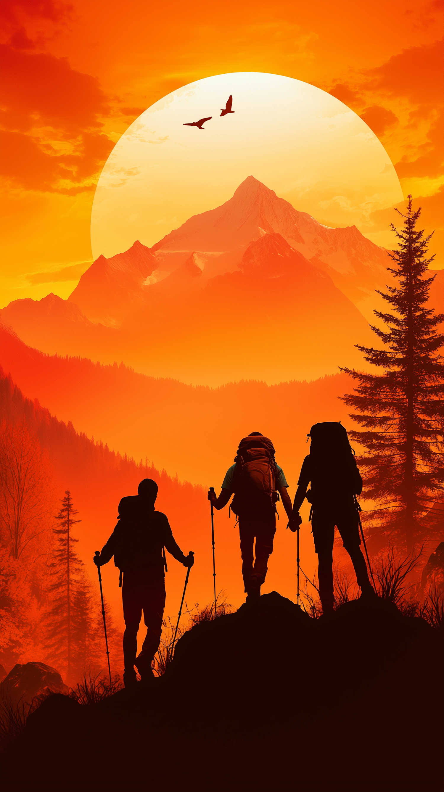 Three hikers silhouetted against a fiery sunset, holding hands and trekking poles, with a majestic mountain and soaring birds in the background.