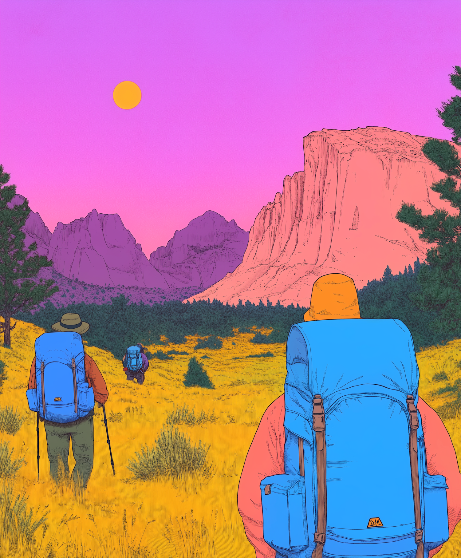 Vibrant illustration of hikers with blue backpacks under a pink sky, exploring a golden field with majestic mountains in the background.