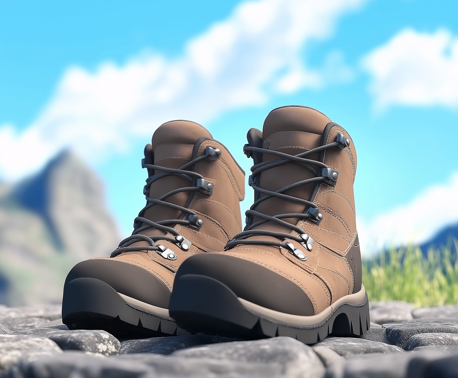 Sturdy brown hiking boots with black soles on a rocky surface, set against a clear blue sky and green grass background.