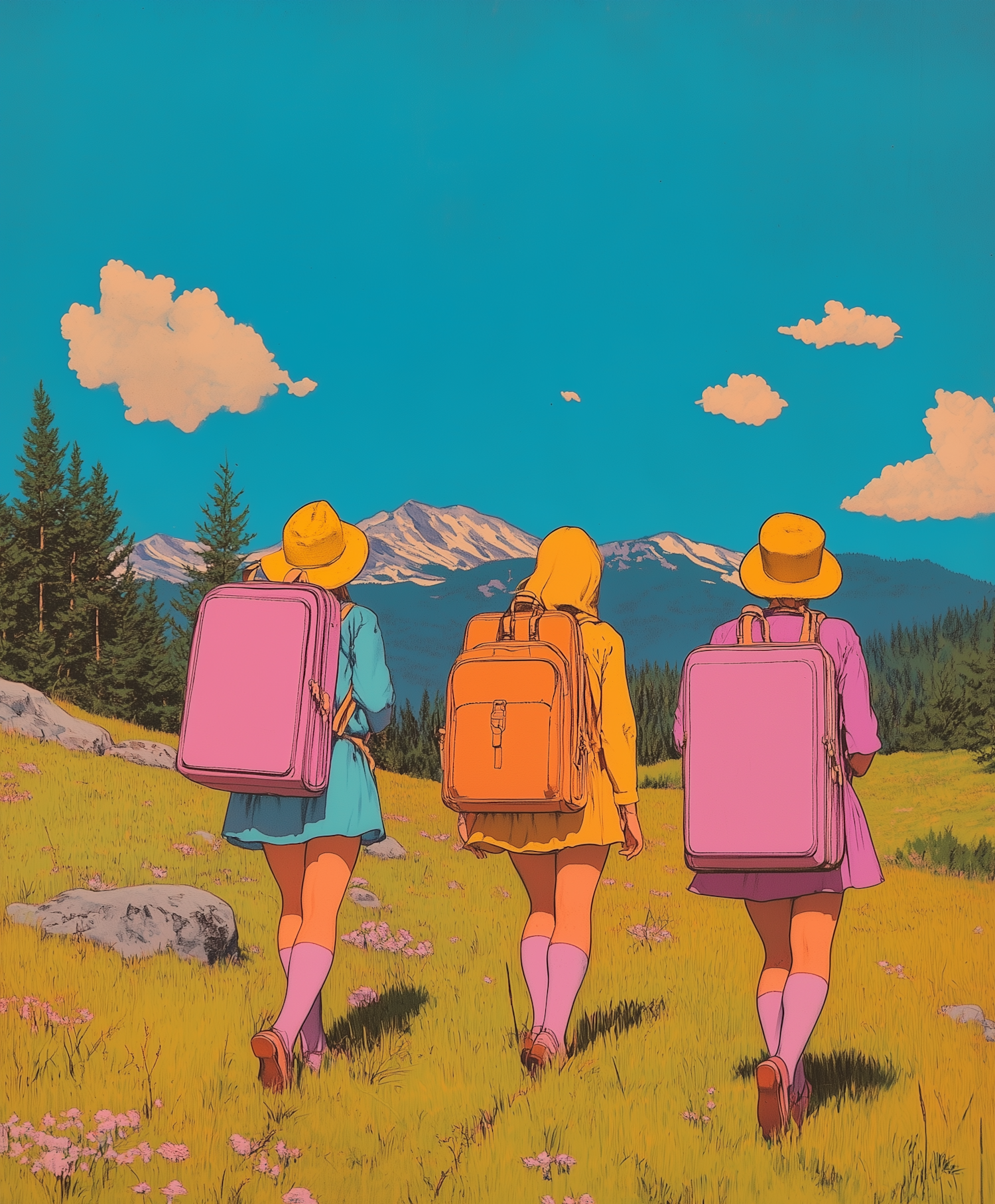 Three people in colorful outfits hike through a vibrant meadow with backpacks, under a clear blue sky and distant mountains.