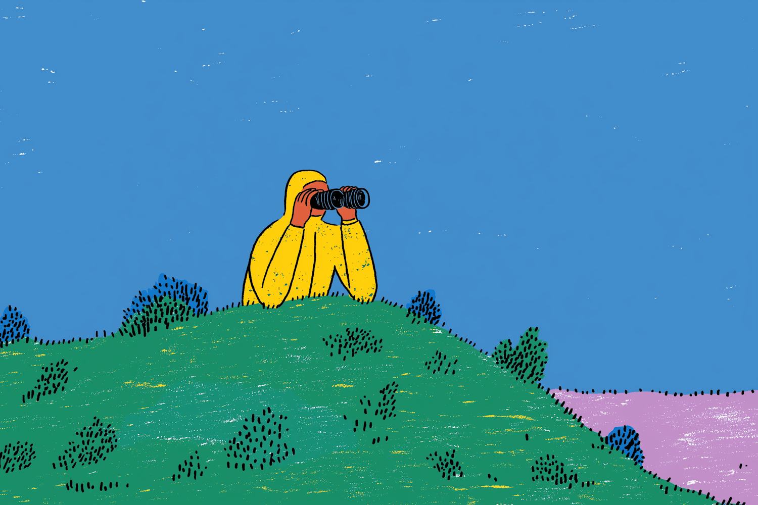 A vibrant illustration of a person in yellow using binoculars on a green hill under a blue sky, surrounded by bushes.