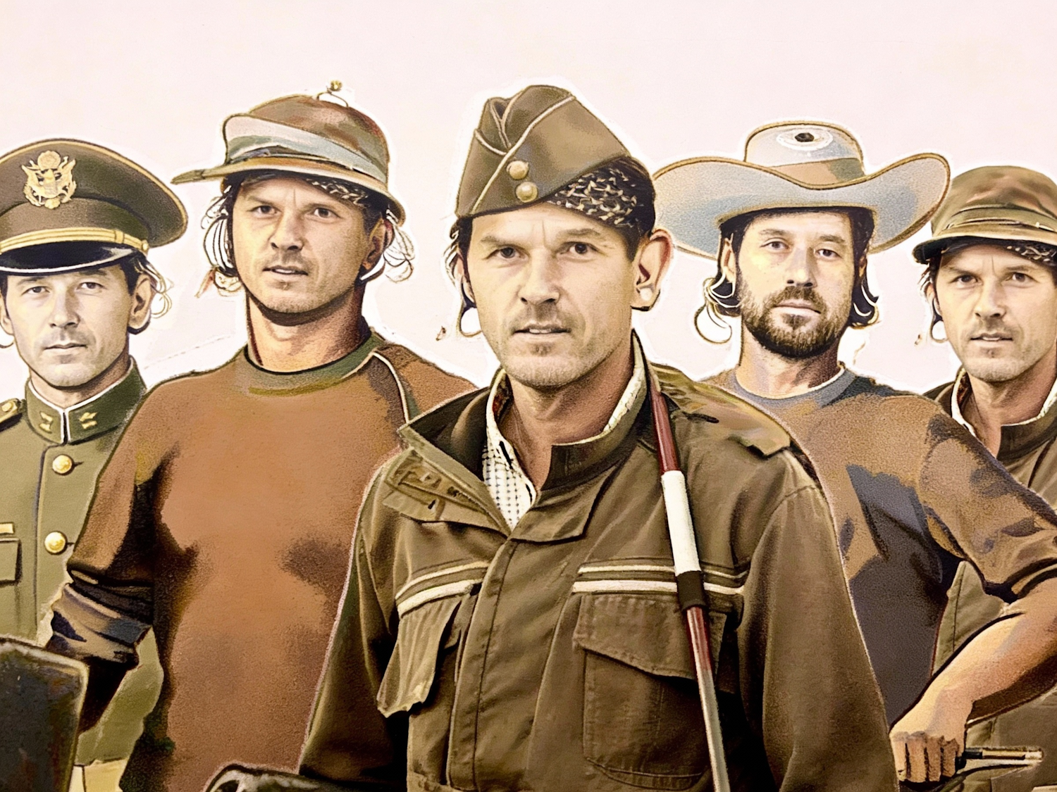 A group of five men in diverse historical and thematic attire, each with unique expressions and styles, set against a neutral background.