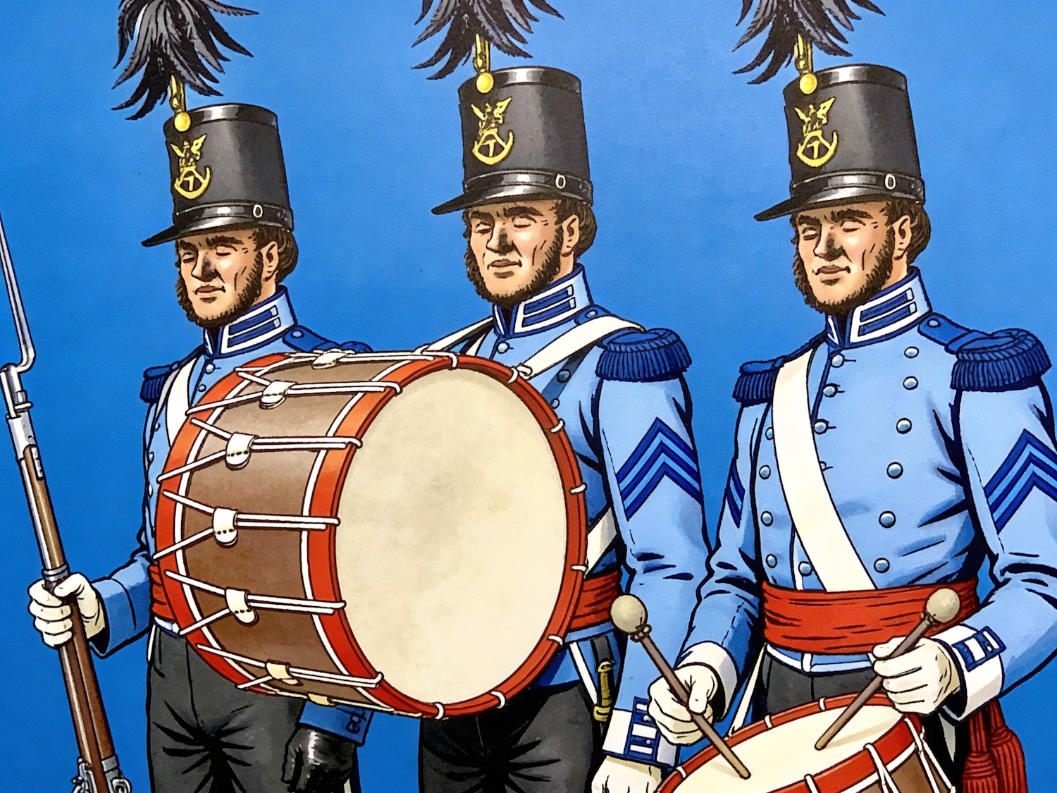 Illustration of three soldiers in blue uniforms with drums and a rifle, showcasing historical military attire against a blue background.