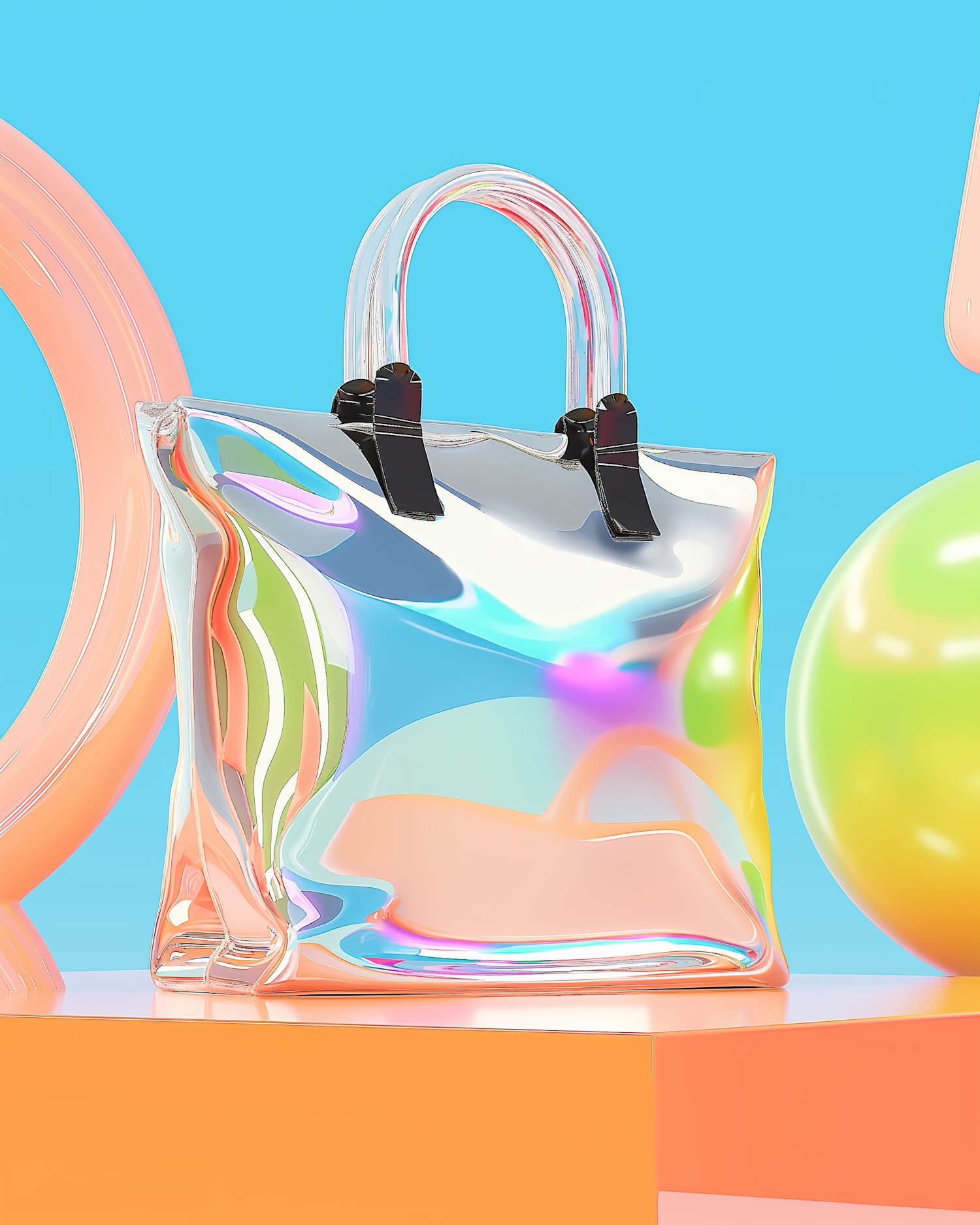 A holographic tote bag with black straps on a bright orange surface, surrounded by colorful abstract shapes and a blue background.