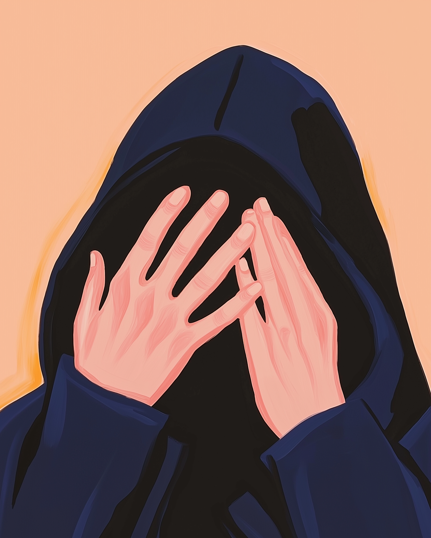Stylized illustration of a hooded figure covering their face with pale hands against a peach background, evoking mystery and introspection.