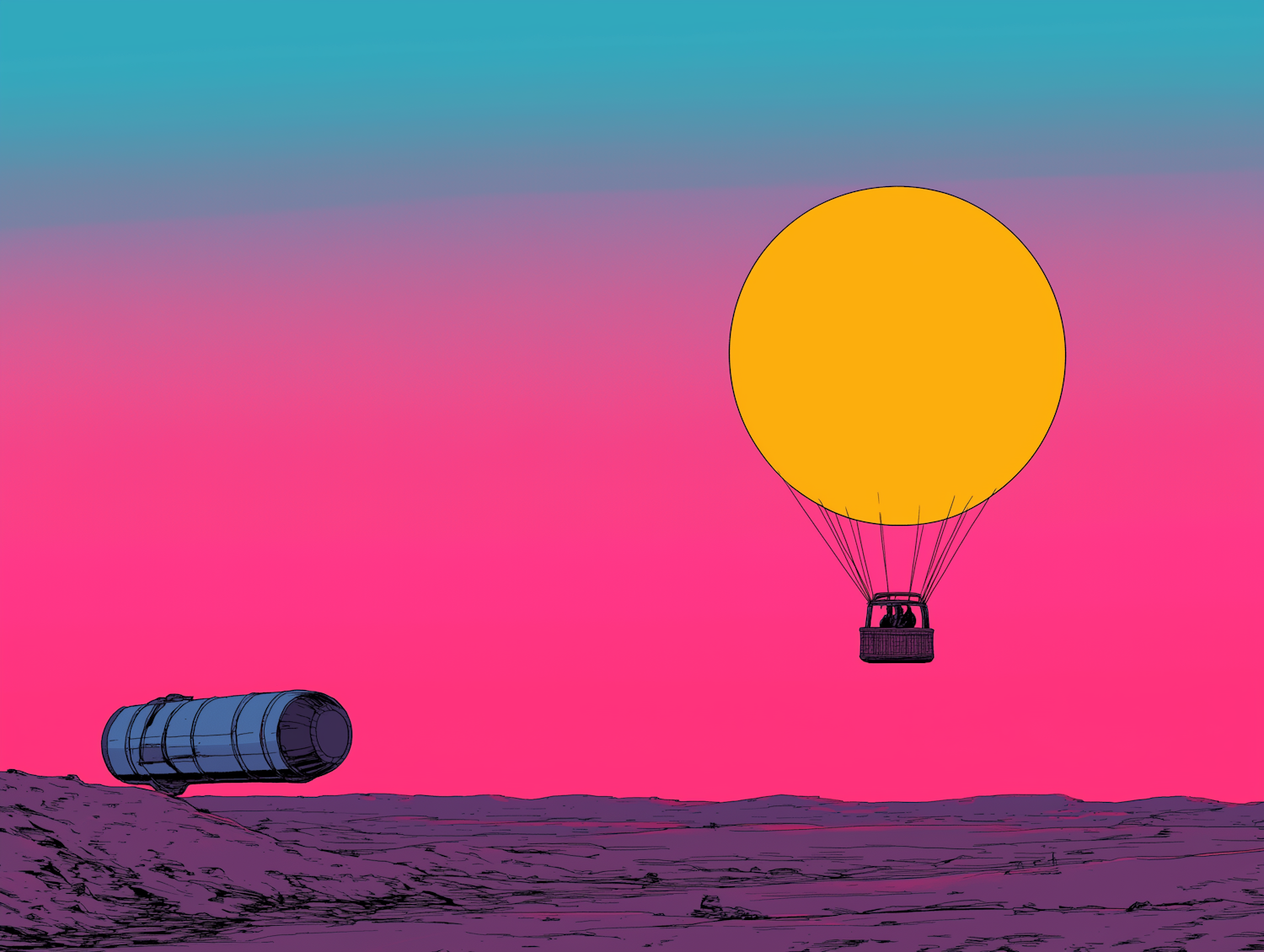 Surreal landscape with a yellow hot air balloon against a turquoise to pink gradient sky, and a cylindrical structure on rocky terrain.