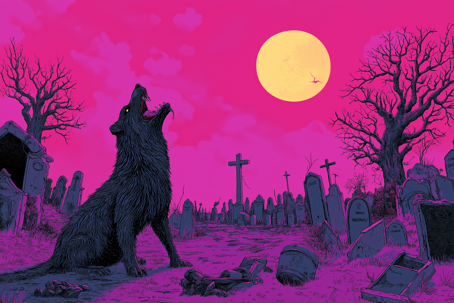 Eerie graveyard scene with a howling black wolf, glowing yellow eyes, and a vivid magenta sky under a full yellow moon.