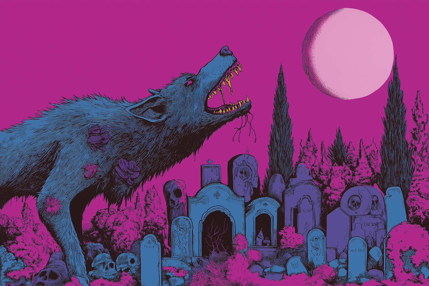 A fierce wolf howls in a graveyard under a pink sky, surrounded by tombstones and skulls, with a large moon casting an eerie glow.